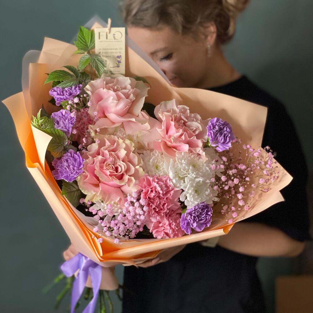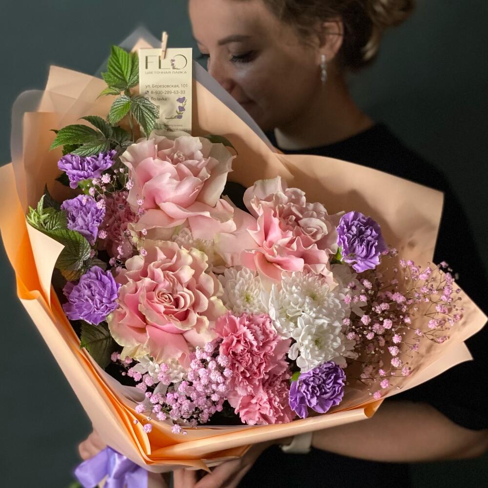 Гипсофила – 1 шт. Лента – 2 шт. Хризантема кустовая – 2 шт. Французская роза – 3 шт. Пистация пучок – 1 шт. Диантус розовый – 3 шт. Современная упаковка – 1 шт. диантус лавандовый – 5 шт. стилизованная зелень – 2 шт.
