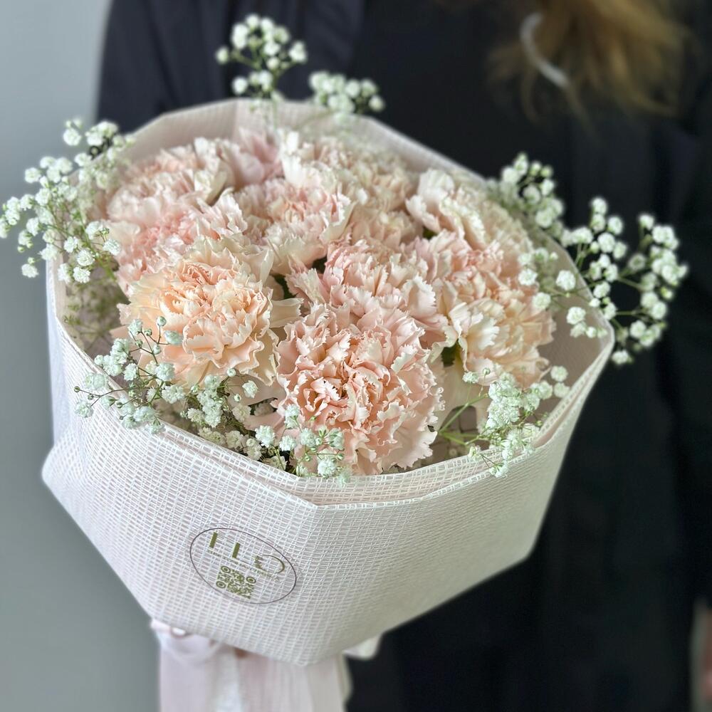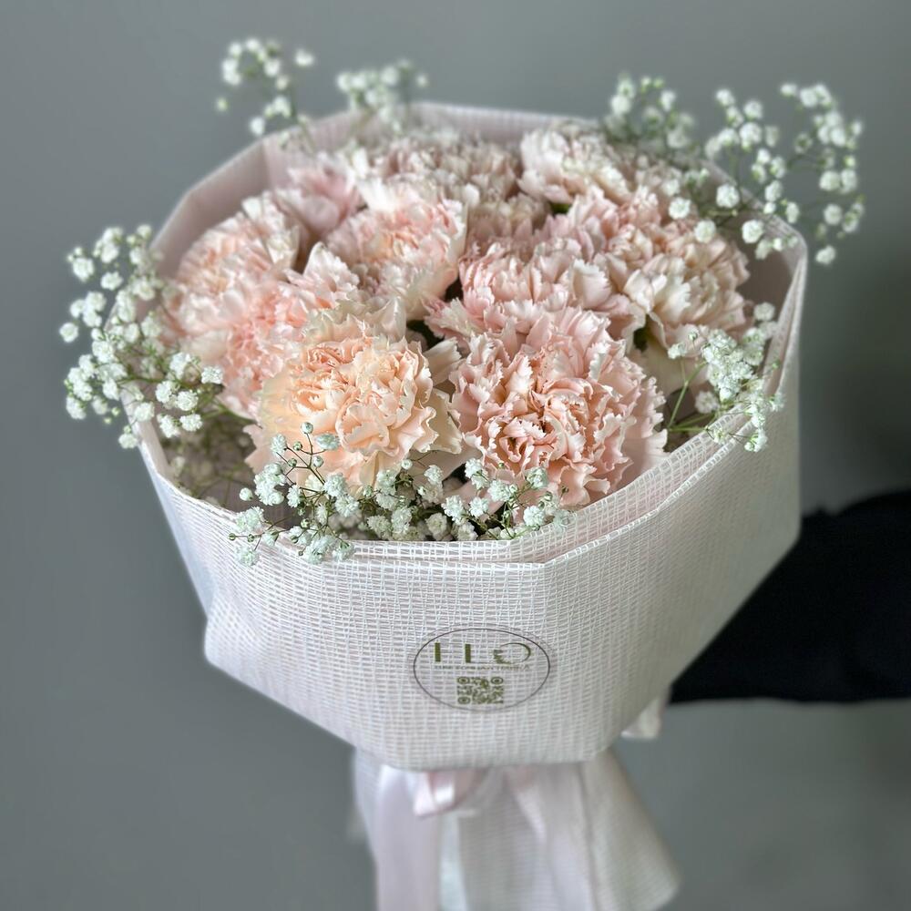Гипсофила – 1 шт. Диантус – 11 шт. Атласная лента – 2 шт. Дизайнерская упаковка – 1 шт.