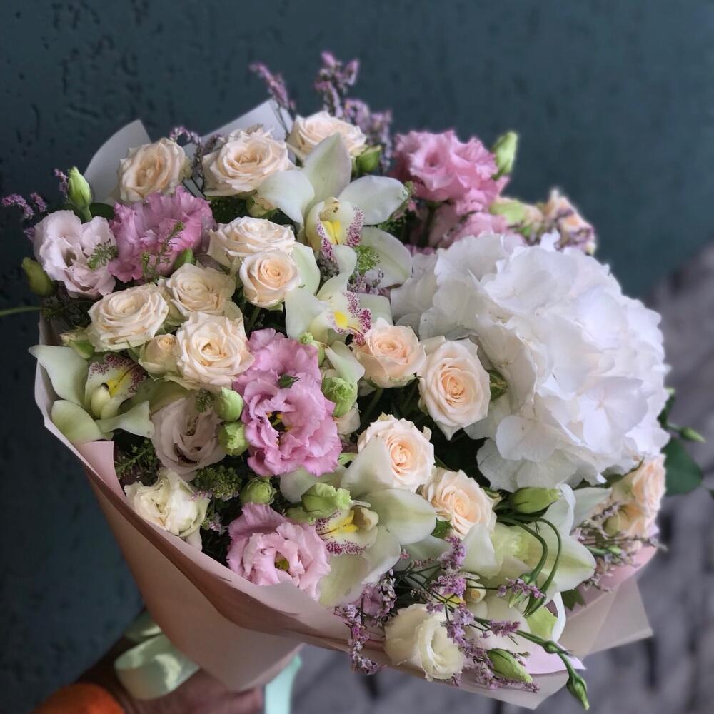 Гортензия - 1 шт. Лизиантус - 5 шт. Орхидея Цимбидиум - 5 шт. Роза кустовая - 7 шт.