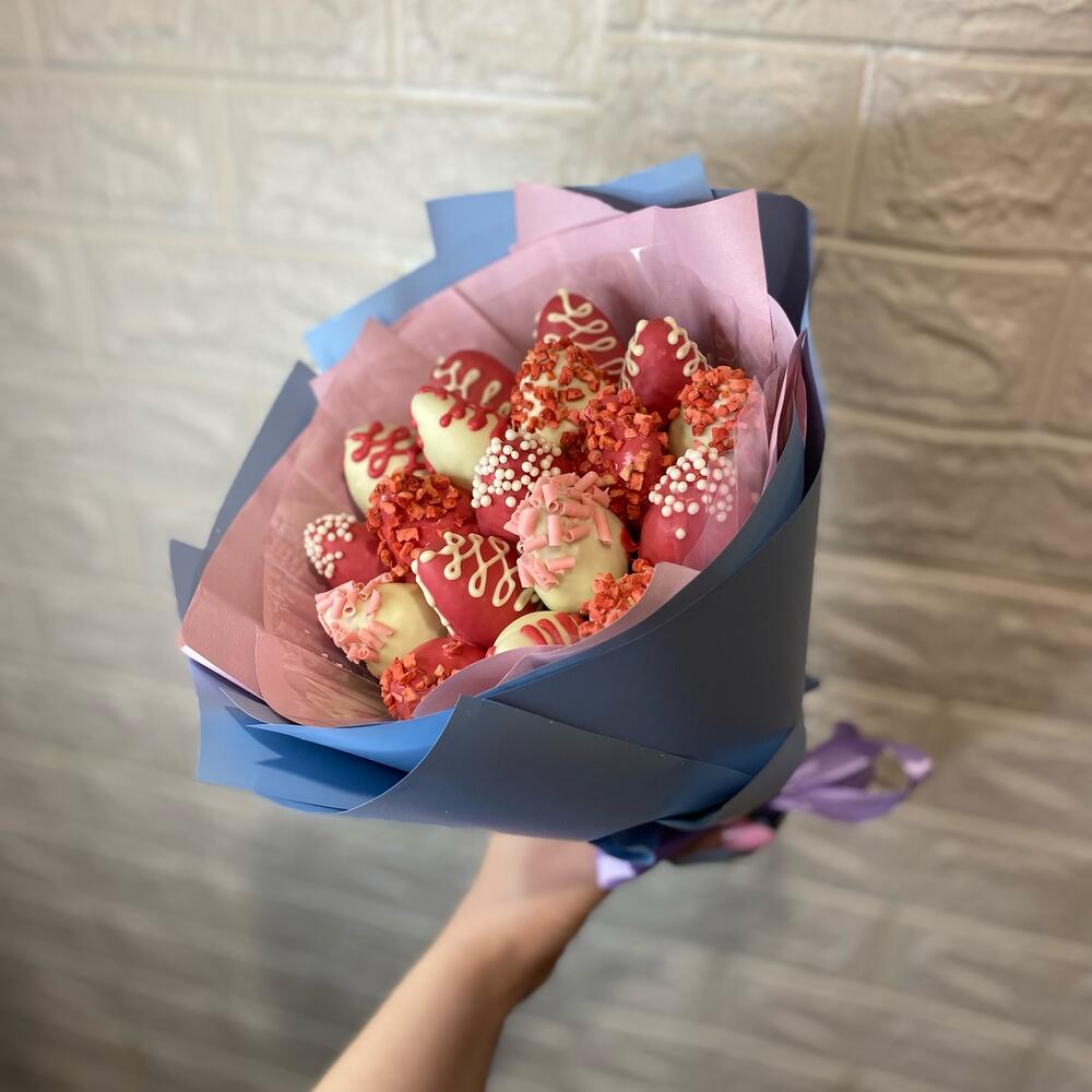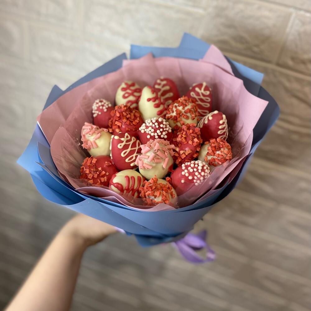 Лента атласная – 2 шт. Упаковка дизайнерская – 3 шт. Клубника в шоколаде callebaut (бельгия) – 19 шт.