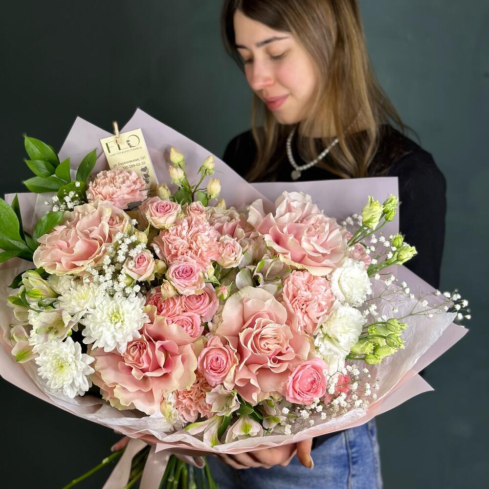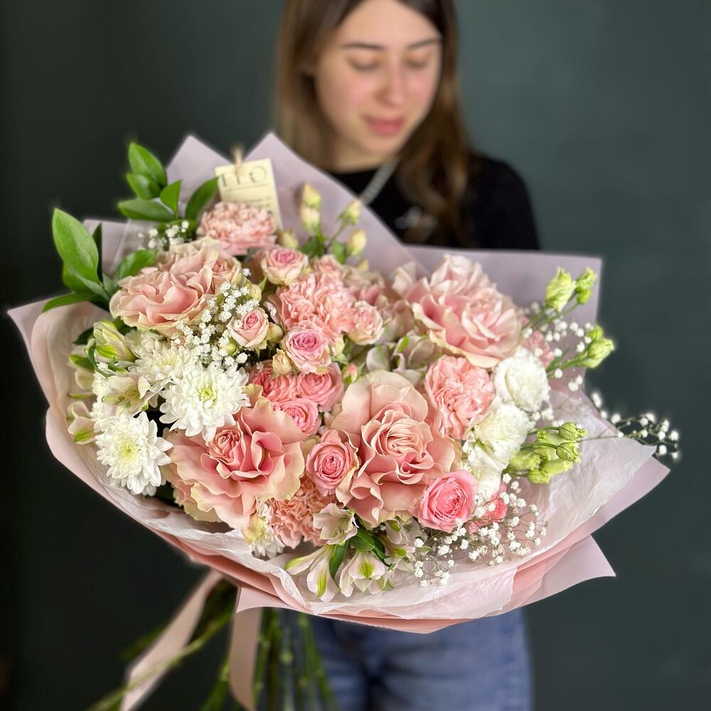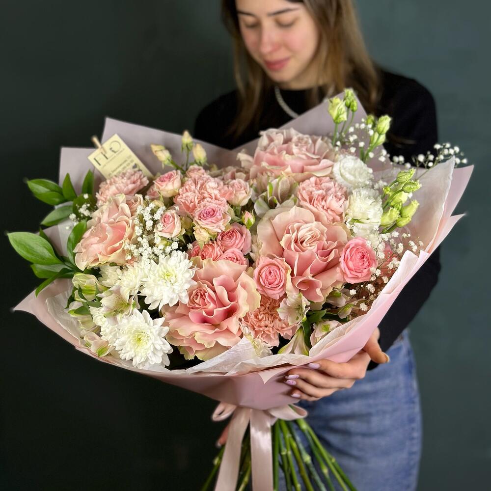 Альстромерия - 3 шт. Гипсофила - 1 шт. Рускус - 2 шт. Хризантема кустовая - 3 шт. Лента атласная - 1 шт. Диантус - 5 шт. Роза кустовая Голландия - 3 шт. Роза французская - 5 шт. Лизиантус махровый - 1 шт. современная упаковка с тишью - 1 шт.