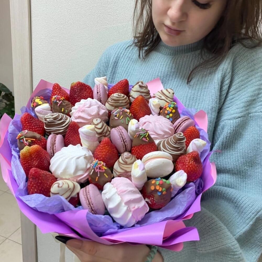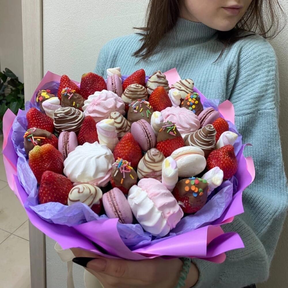 Клубника – 150 гр. Лента атласная – 1 шт. Зефир – 4 шт. Упаковка дизайнерская – 4 шт. Маршмеллоу – 80 гр. макарон (пирожное) – 5 шт. глубника в бельгийском шоколаде – 150 гр.