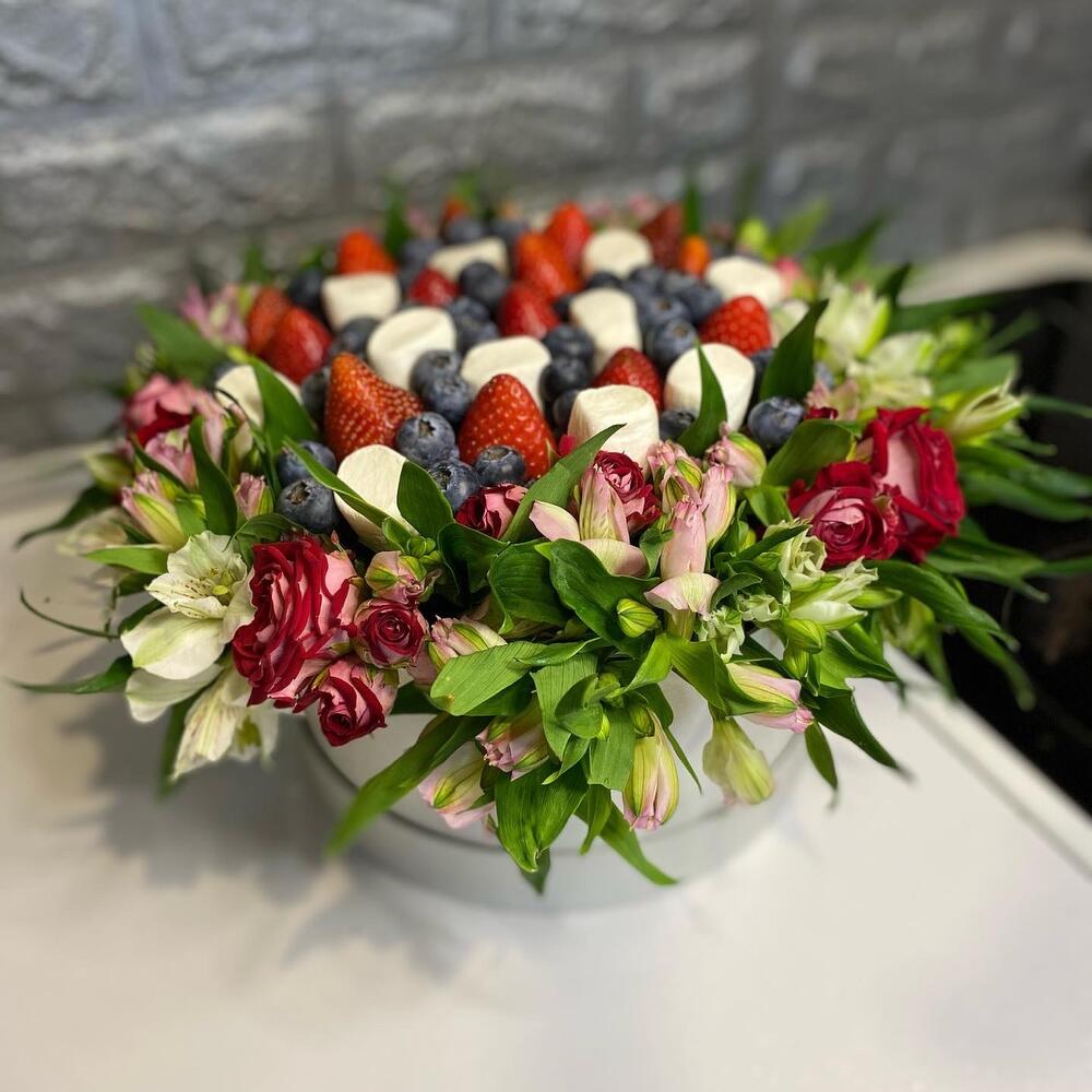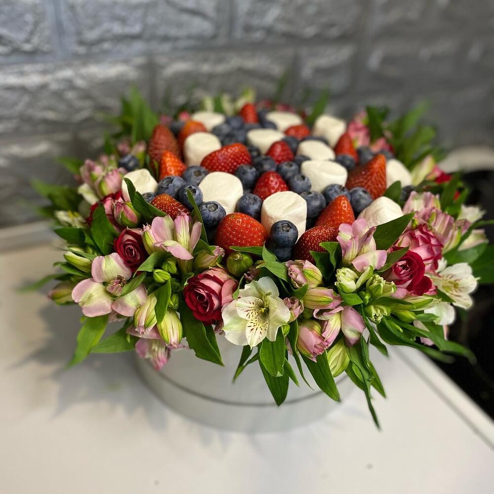 Альстромерия – 15 шт. Клубника – 400 гр. Шляпная коробка – 1 шт. Голубика – 100 гр. Маршмеллоу – 80 гр.