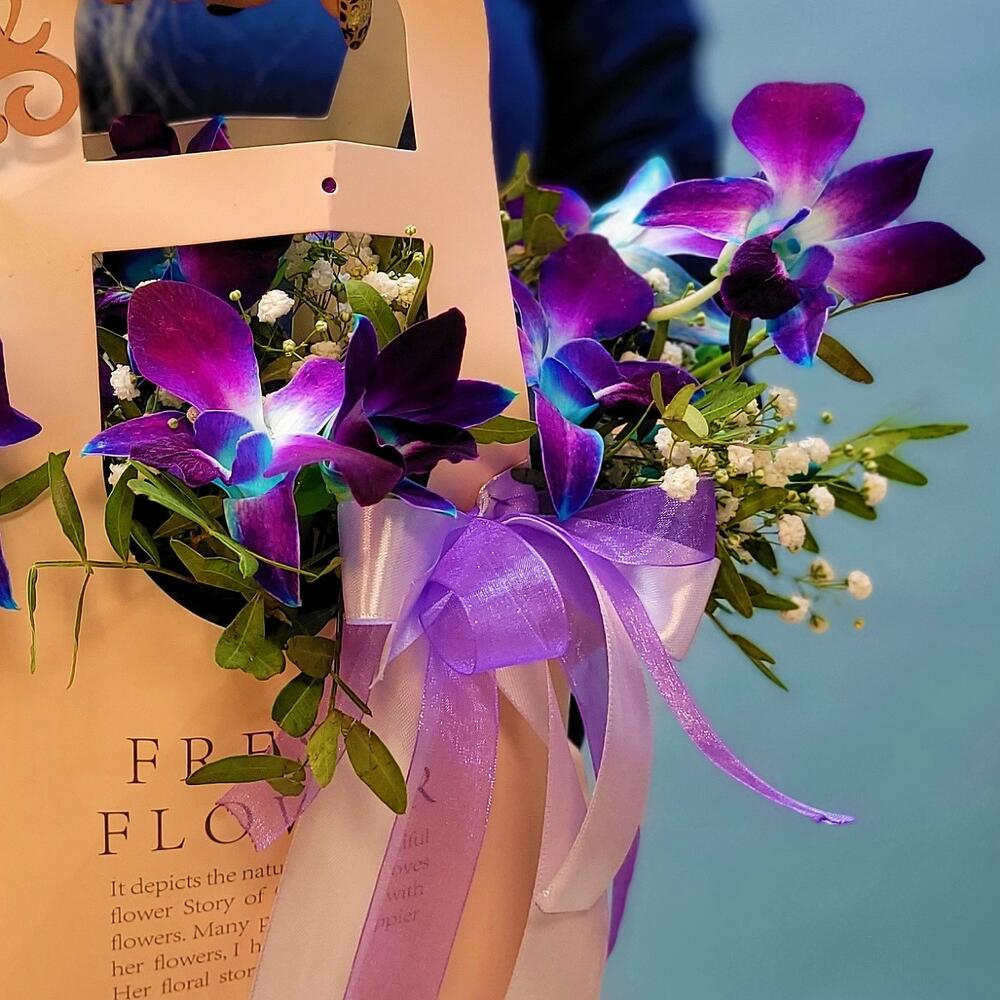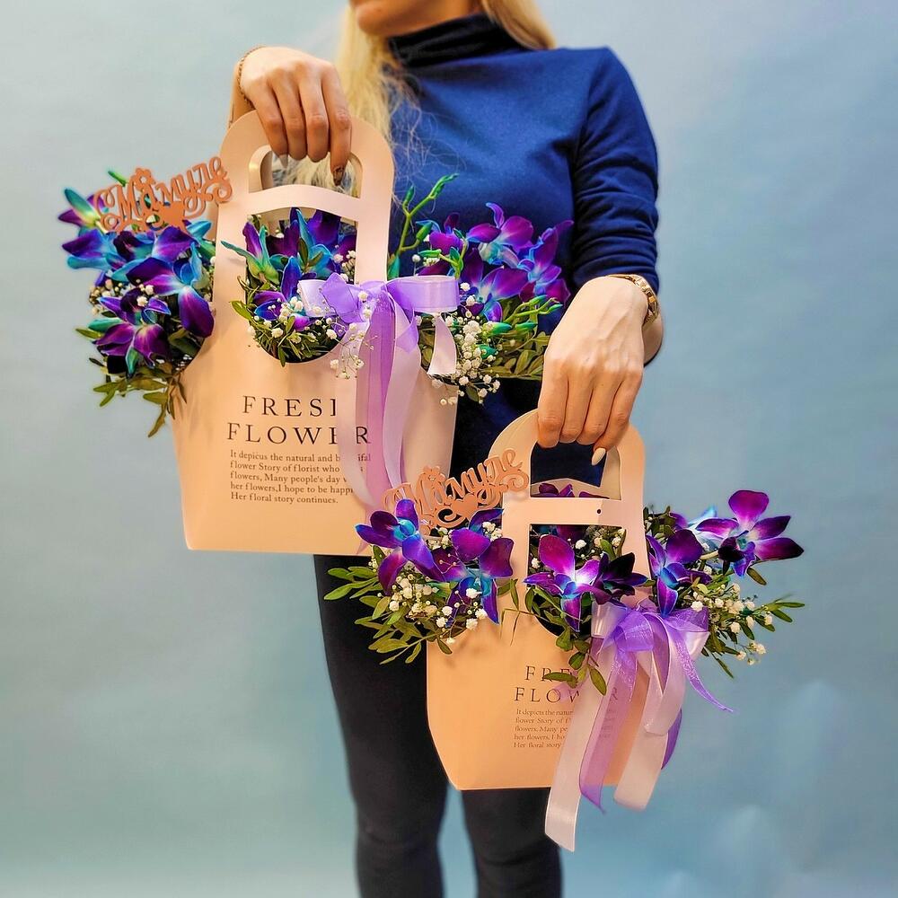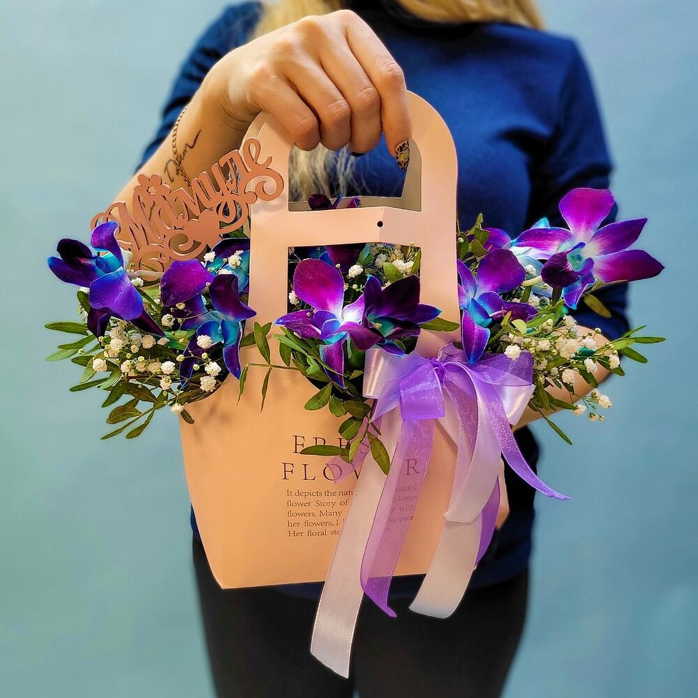 Гипсофила – 1 шт. Лента – 2 шт. Оазис – 1 шт. Фисташка – 3 шт. Сумка – 1 шт. Дендробиум – 2 шт. Топпер – 1 шт.