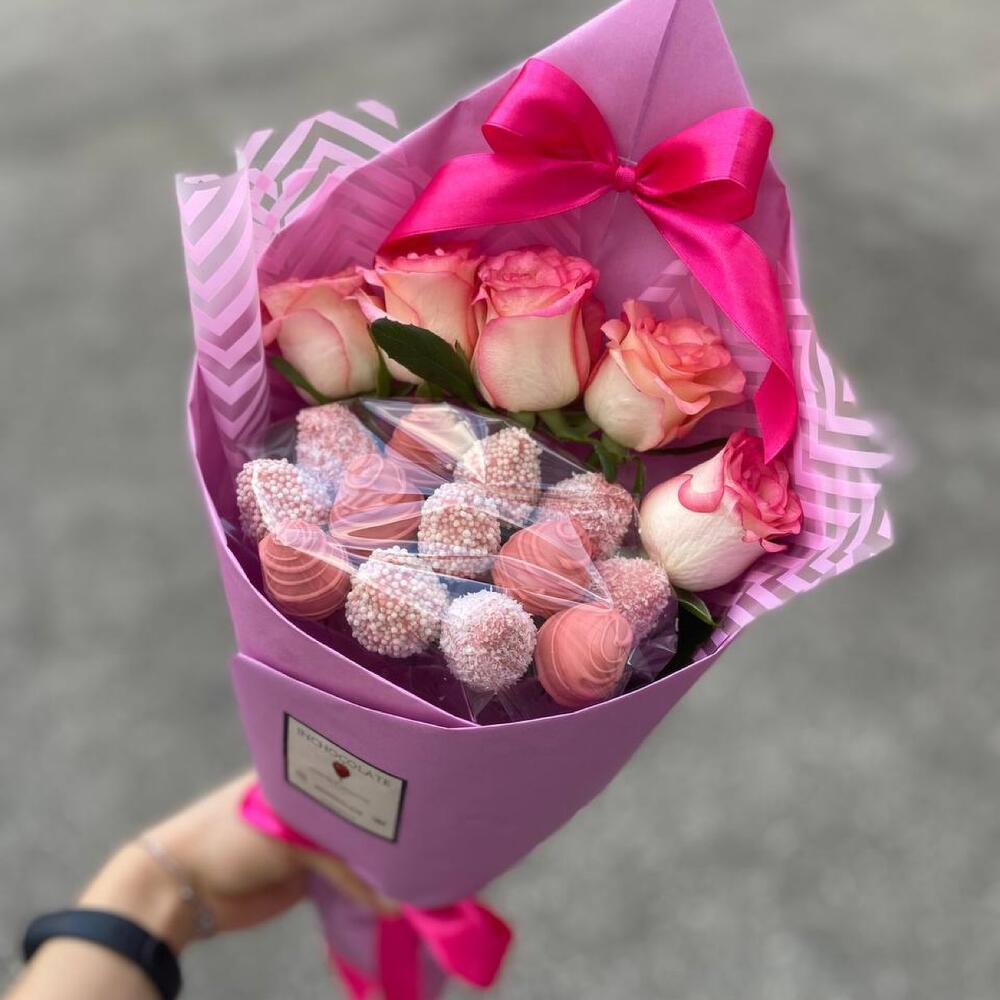 Роза – 5 шт. Упаковка – 2 шт. Клубника в шоколаде – 180 гр.