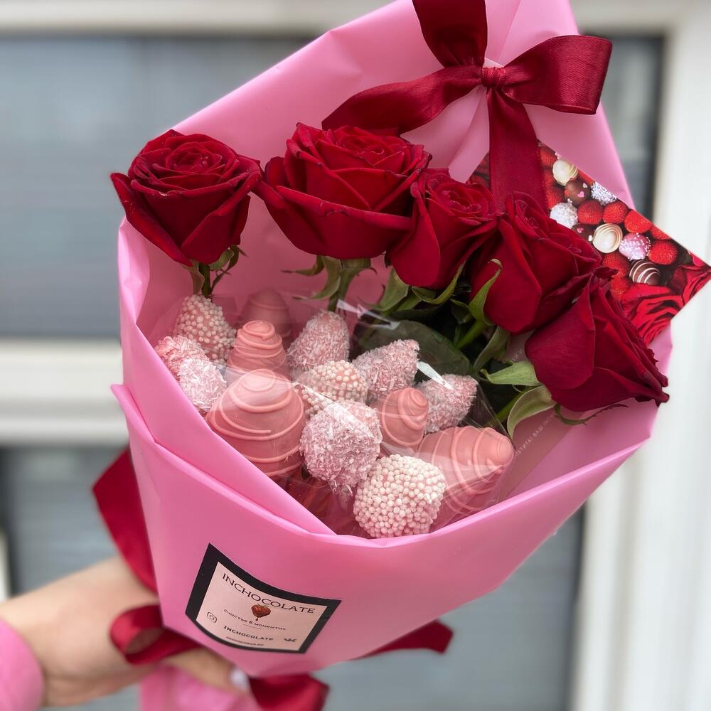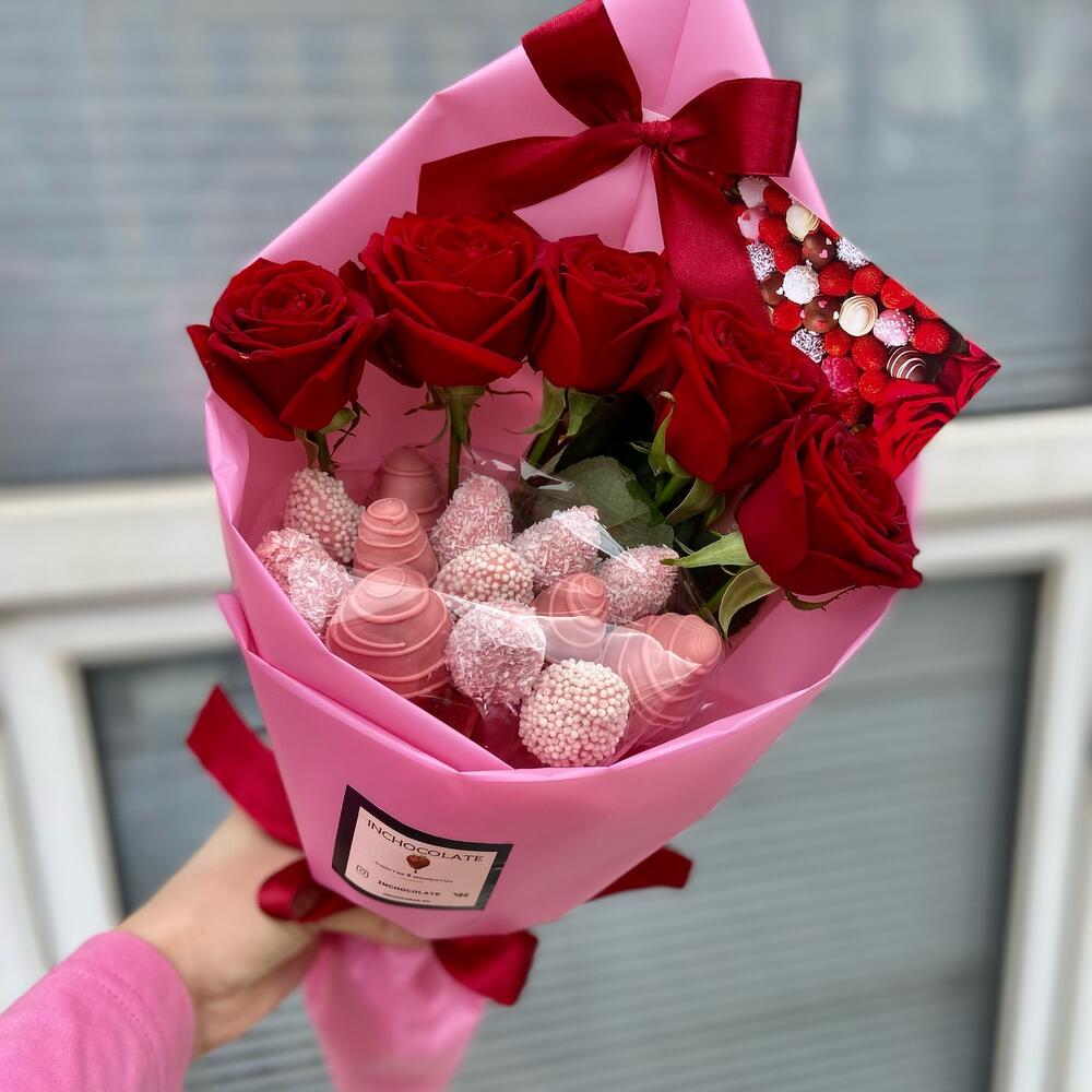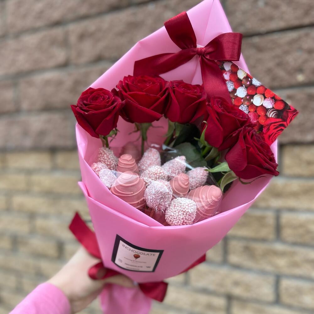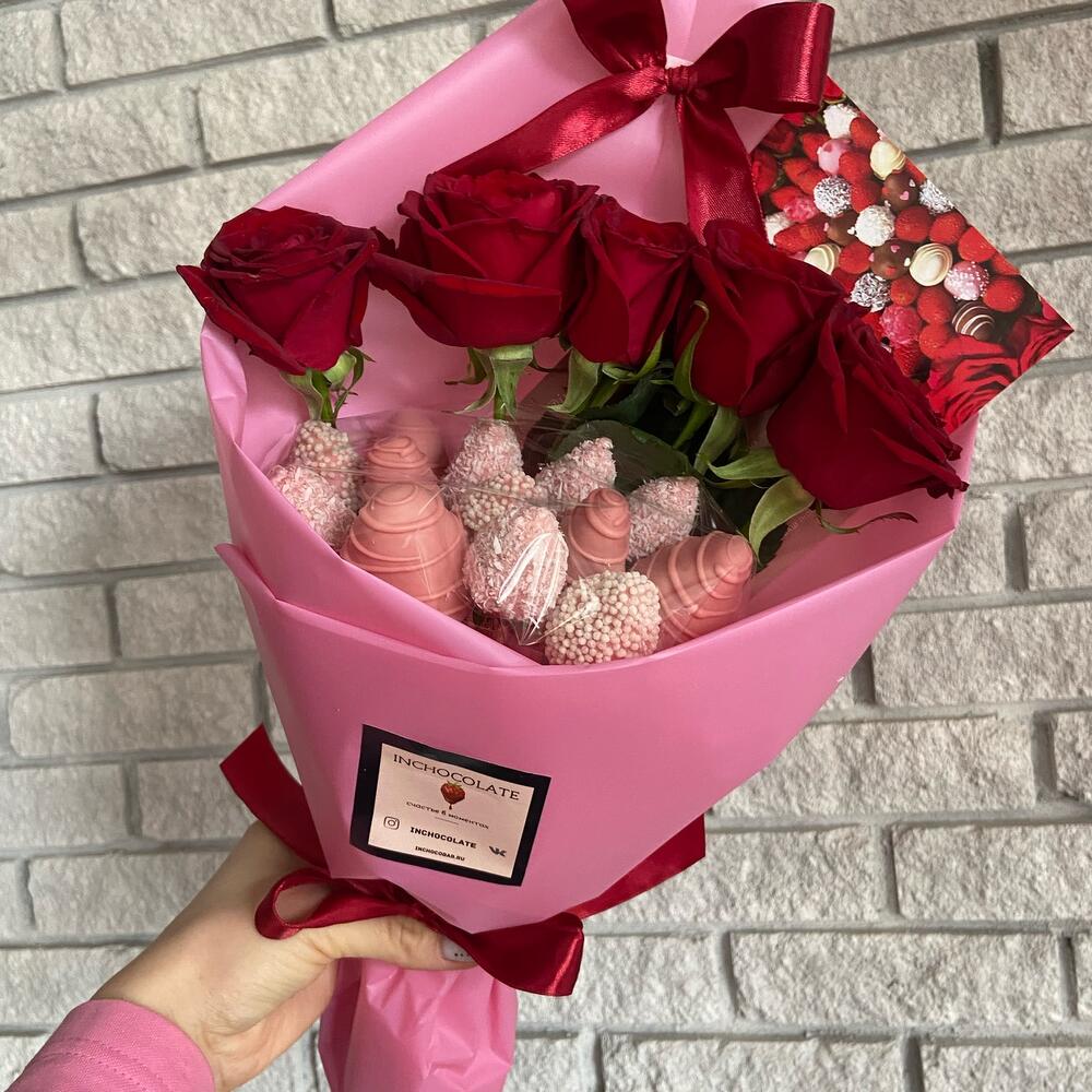 Роза красная – 5 шт. Упаковка – 1 шт. Клубника в шоколаде callebaut (бельгия) – 180 гр.