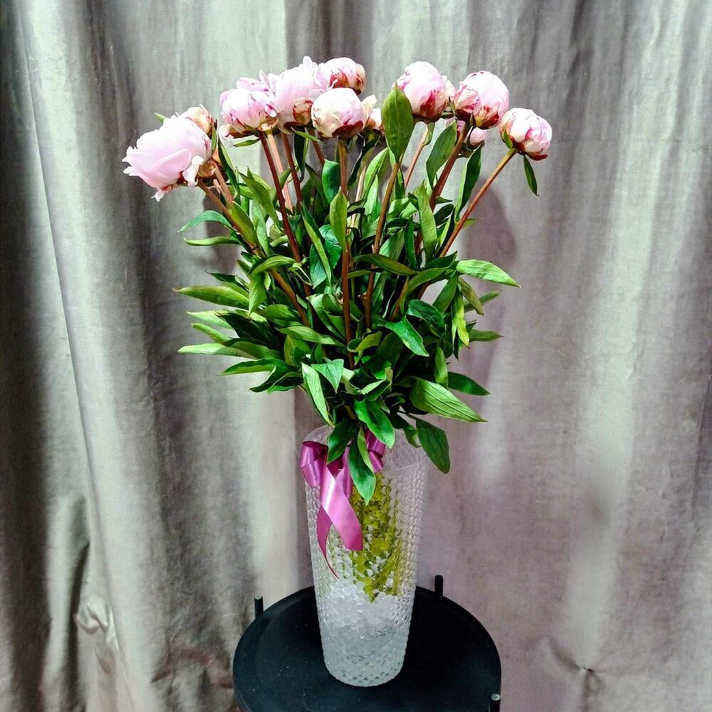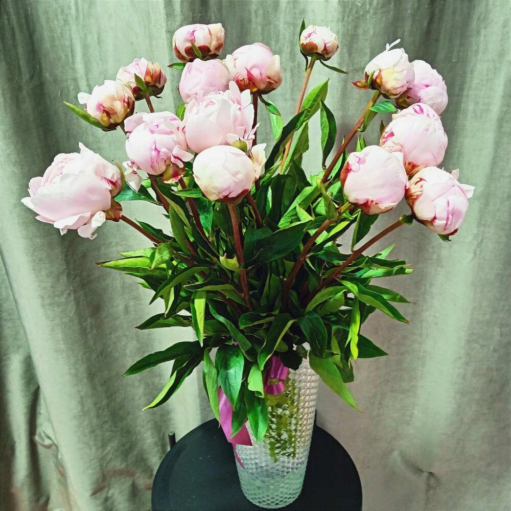 Лента атласная – 2 шт. Пион Сара Бернар – 15 шт. подкормка для срезанных цветов – 1 шт.