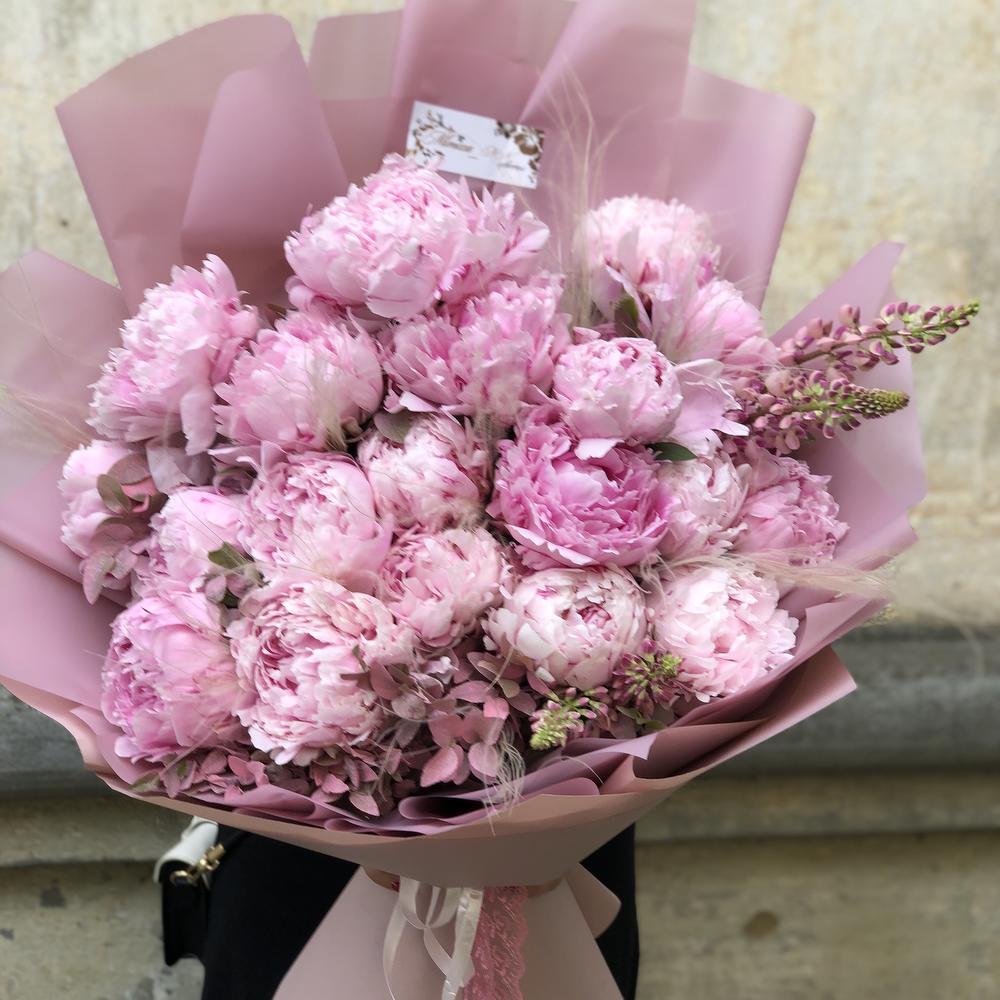 Лента – 2 шт. Пион – 19 шт. Зелень – 10 шт. Упаковка – 8 шт. Люпины – 4 шт. Стифа – 8 шт.