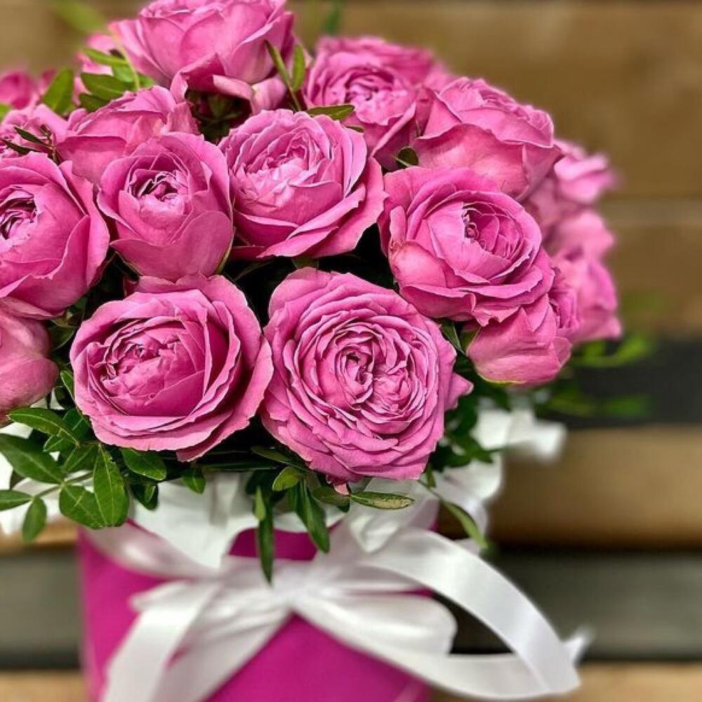 Лента атласная – 2 шт. Коробка шляпная – 1 шт. Роза кустовая пионовидная – 7 шт. Оазис флористический – 1 шт. зелень декоративная – 6 шт.