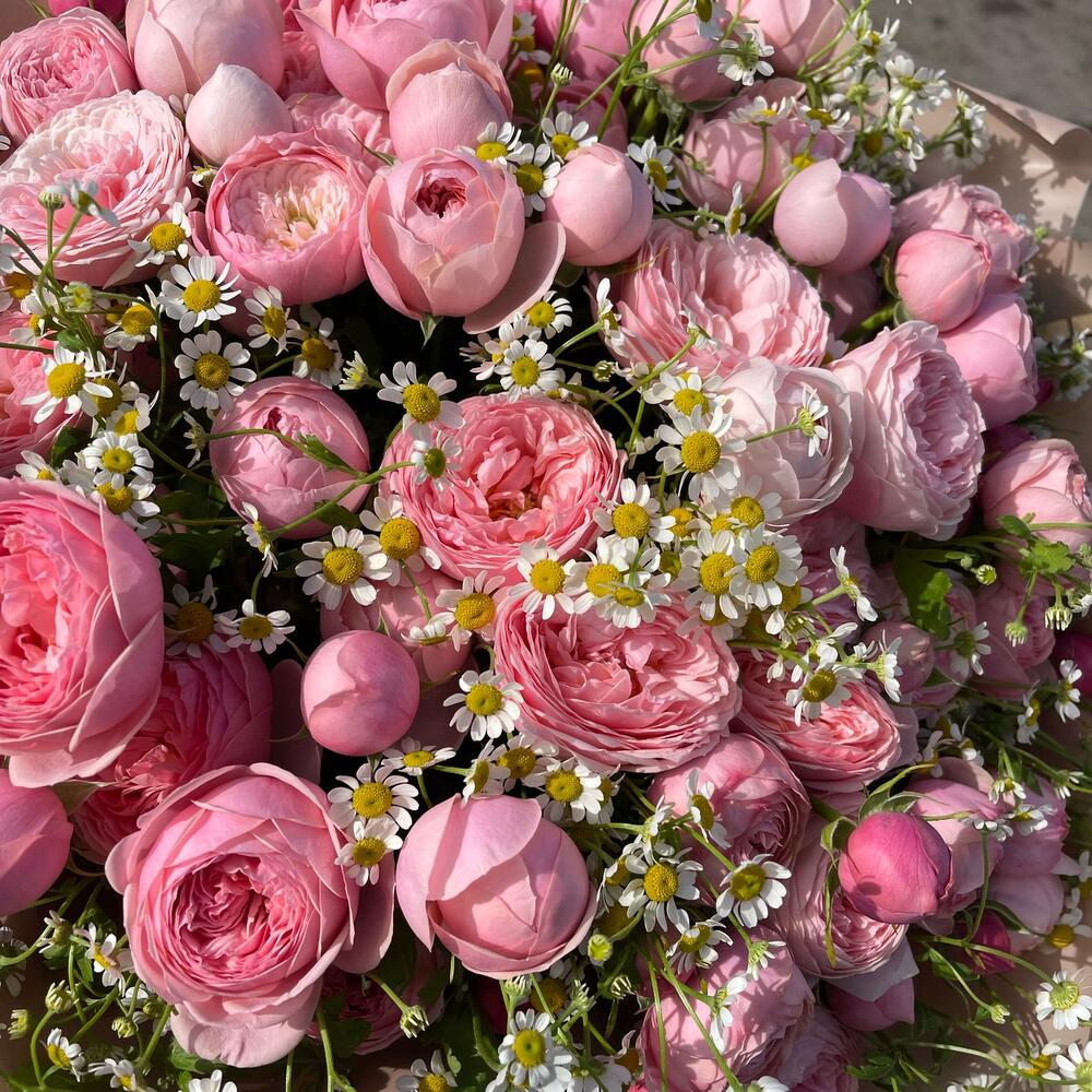 Танацетум - 12 шт. Лента атласная - 2 шт. Упаковка дизайнерская - 1 шт. подкормка для срезанных цветов - 1 шт. роза пионовидная сильва пинк - 13 шт.