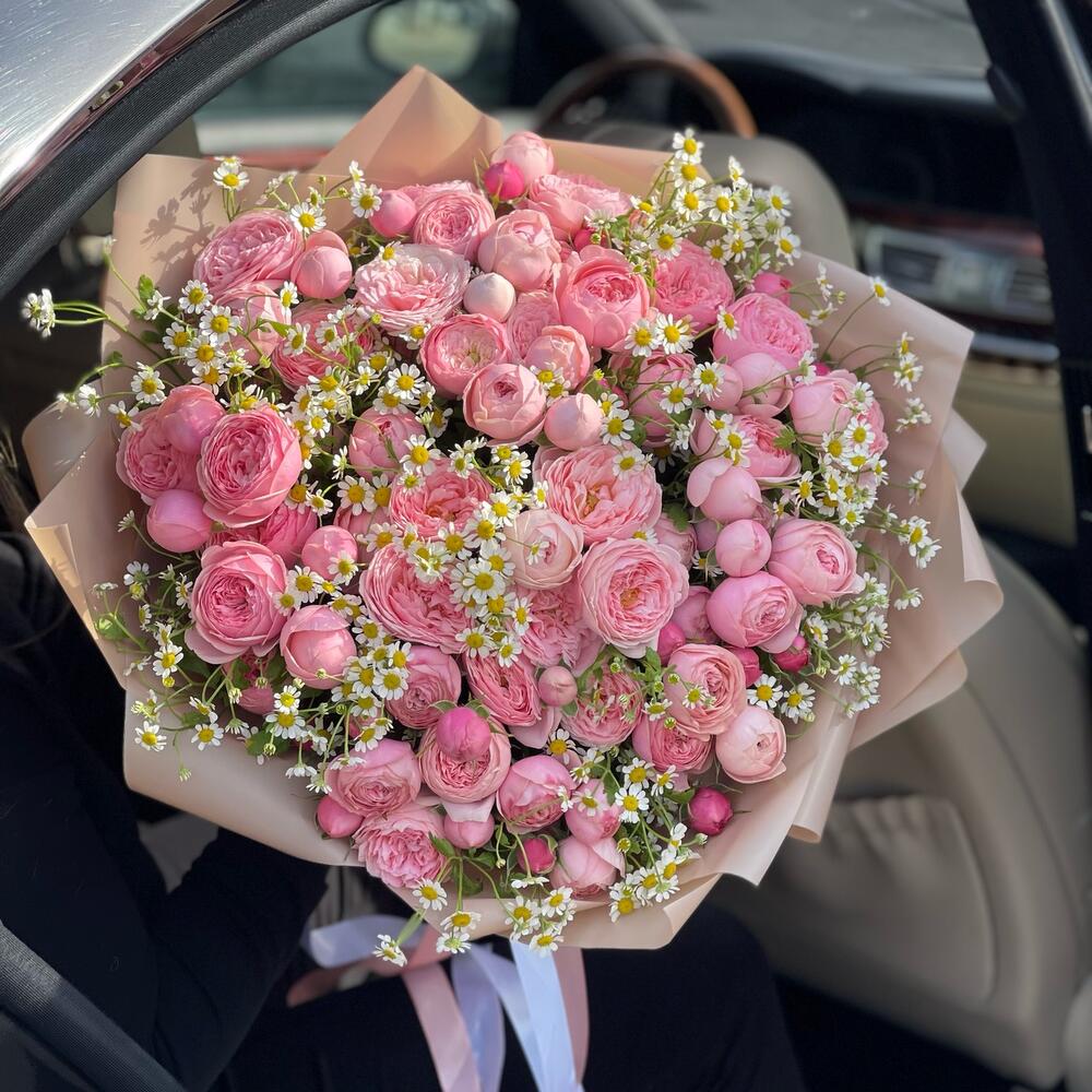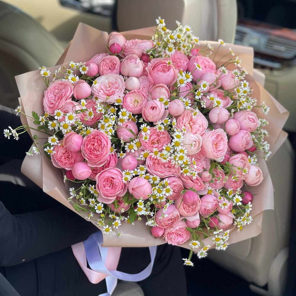 Танацетум – 12 шт. Лента атласная – 2 шт. Упаковка дизайнерская – 1 шт. подкормка для срезанных цветов – 1 шт. роза пионовидная сильва пинк – 13 шт.