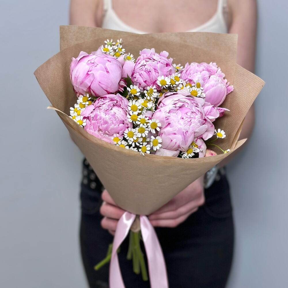 Букет из нежных и красивых розовых пионов с ромашками в крафтовой бумаге Нежно-розовые пионы сорта Сара Бернар отличаются невероятно красивым раскрытием бутона и отменной стойкостью Если Вы хотите рассказать о своих чувствах или просто сделать приятно любимому человеку пионы в крафте можно заказать на доставку в Нижнем НовгородеБукет комплимент из пионов прекрасно подойдет в качестве подарка как без повода, так и на день рождения, свидание, юбилей, подруге, дочери, маме, коллеге, девушке или любимой женеФирменная открытка и подкормка для цветов в подарок