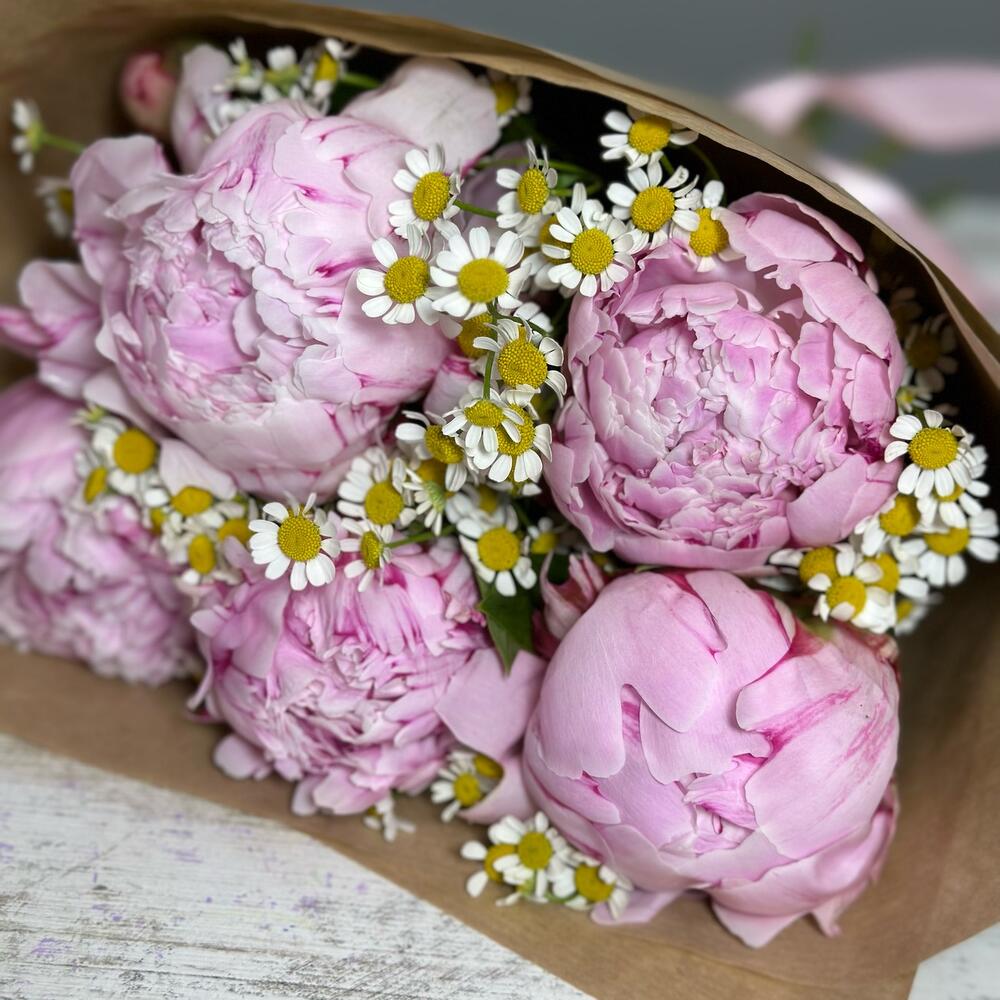 Пионы с ромашками в крафте