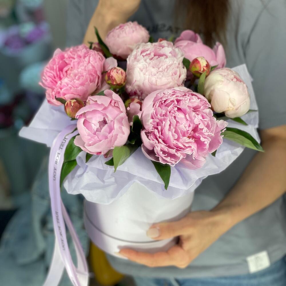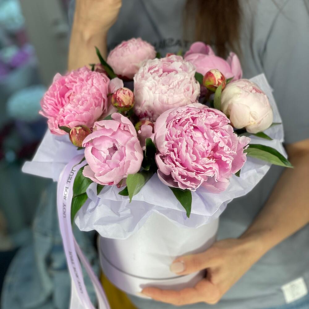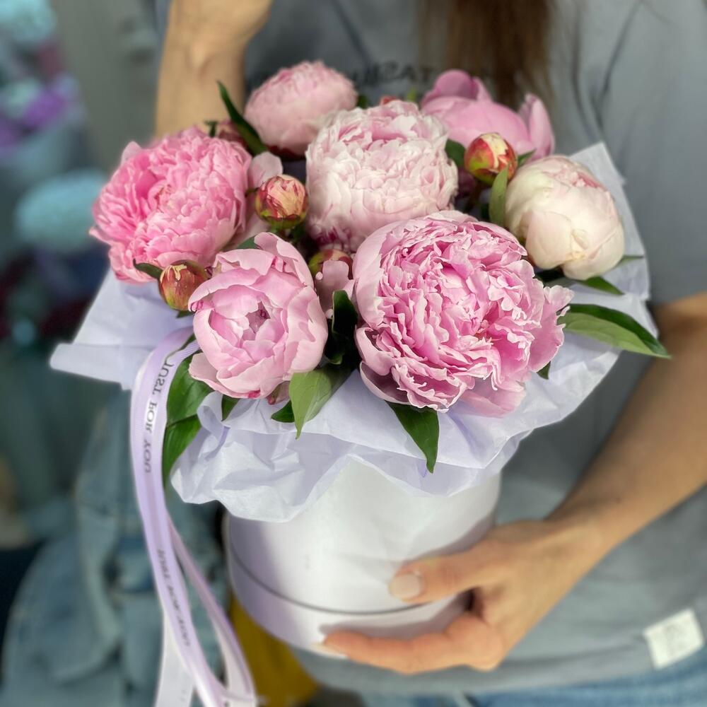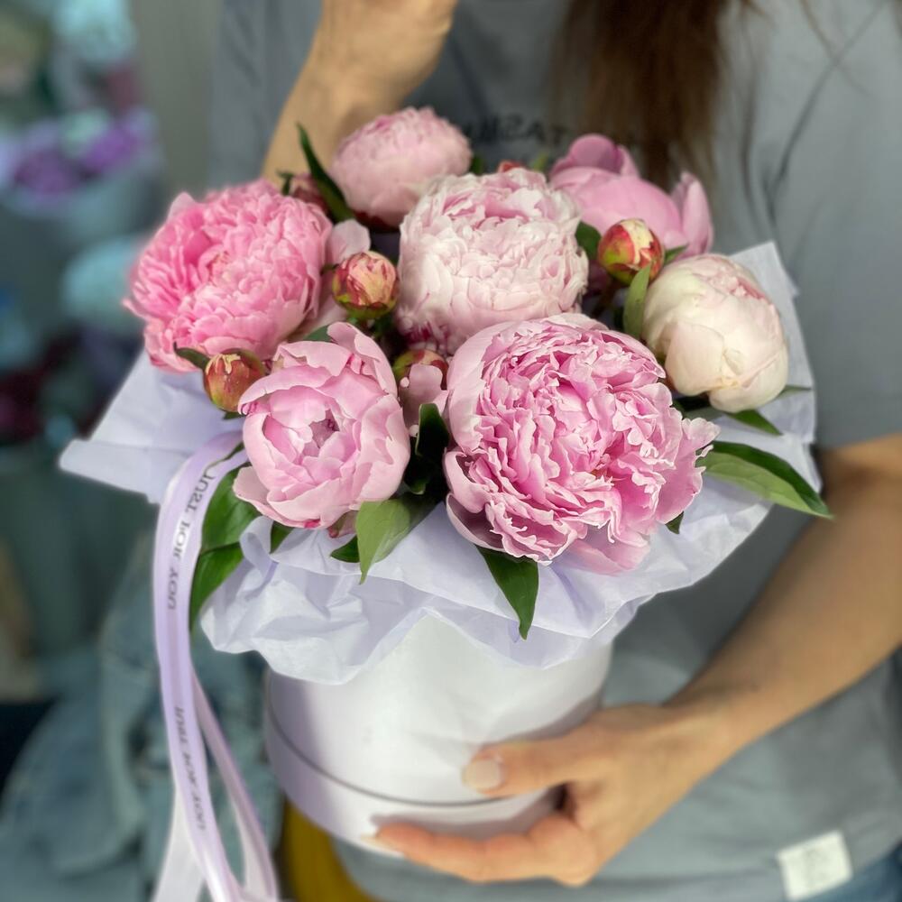 Лента атласная - 2 шт. Коробка - 1 шт. Оазис флористический - 1 шт. Бумага тишью - 1 шт. пионы сара бернар - 7 шт.