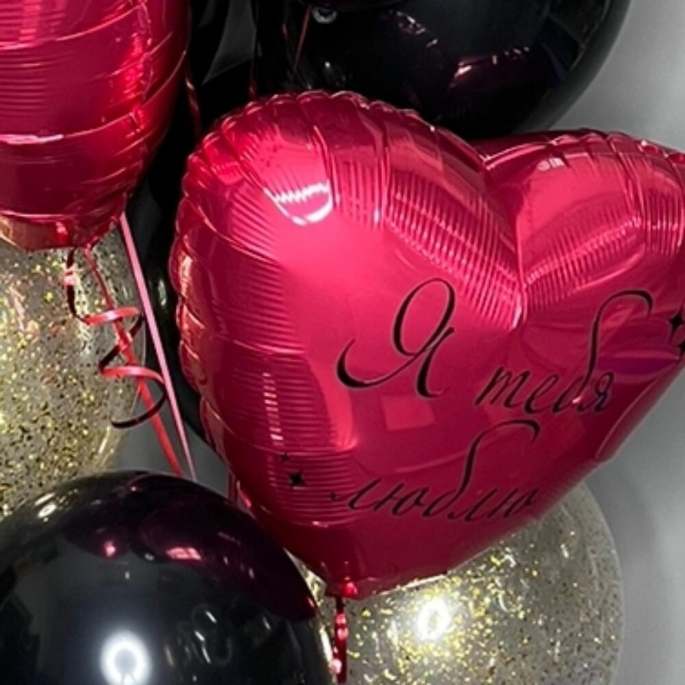 Фонтан из 5 шариков чёрных, 3 шара конфетти, 3 фольгированных шара с вашими надписями 🎈