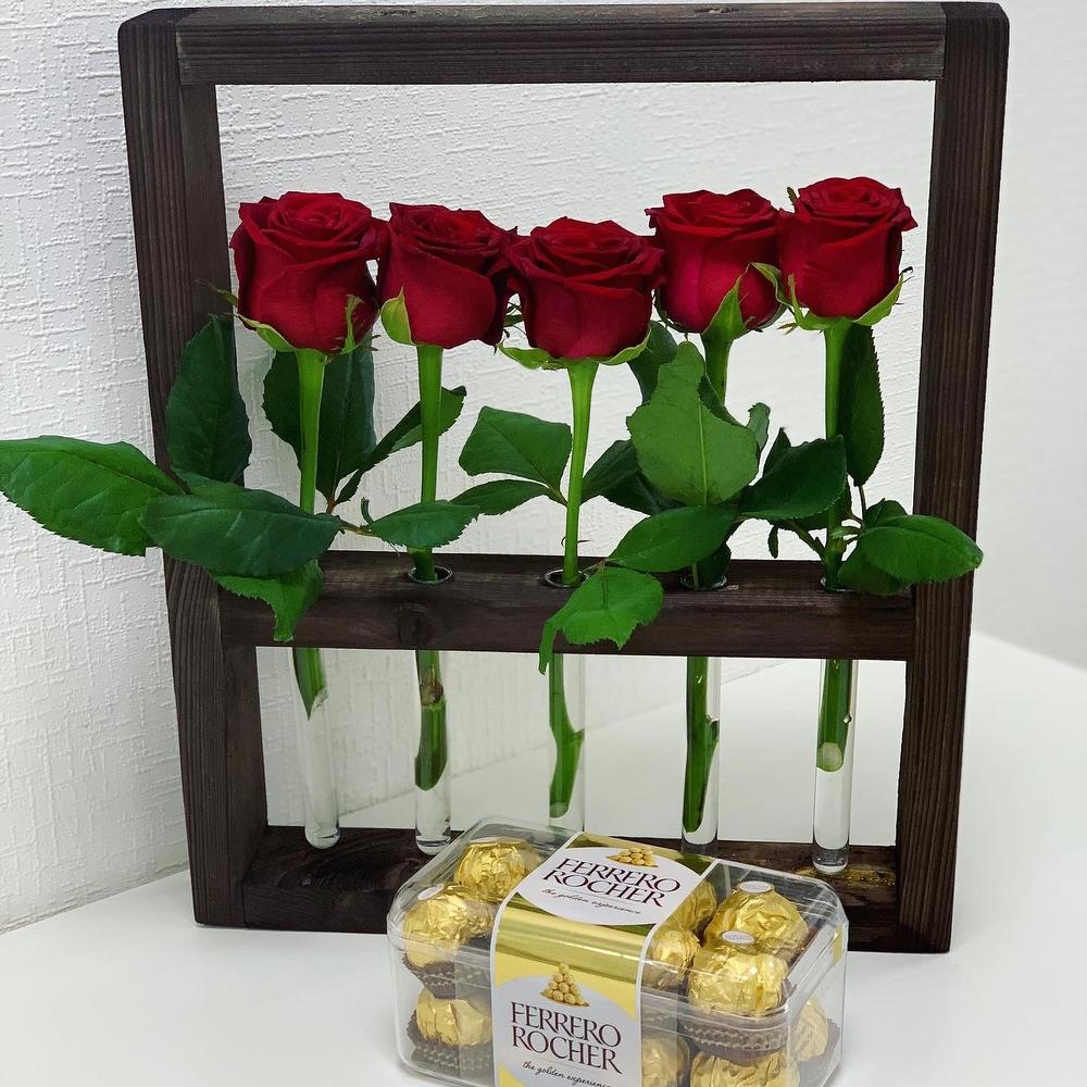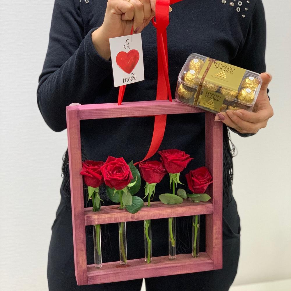 Роза красная - 5 шт. Конфеты - 1 шт. Ящик деревянный - 1 шт.