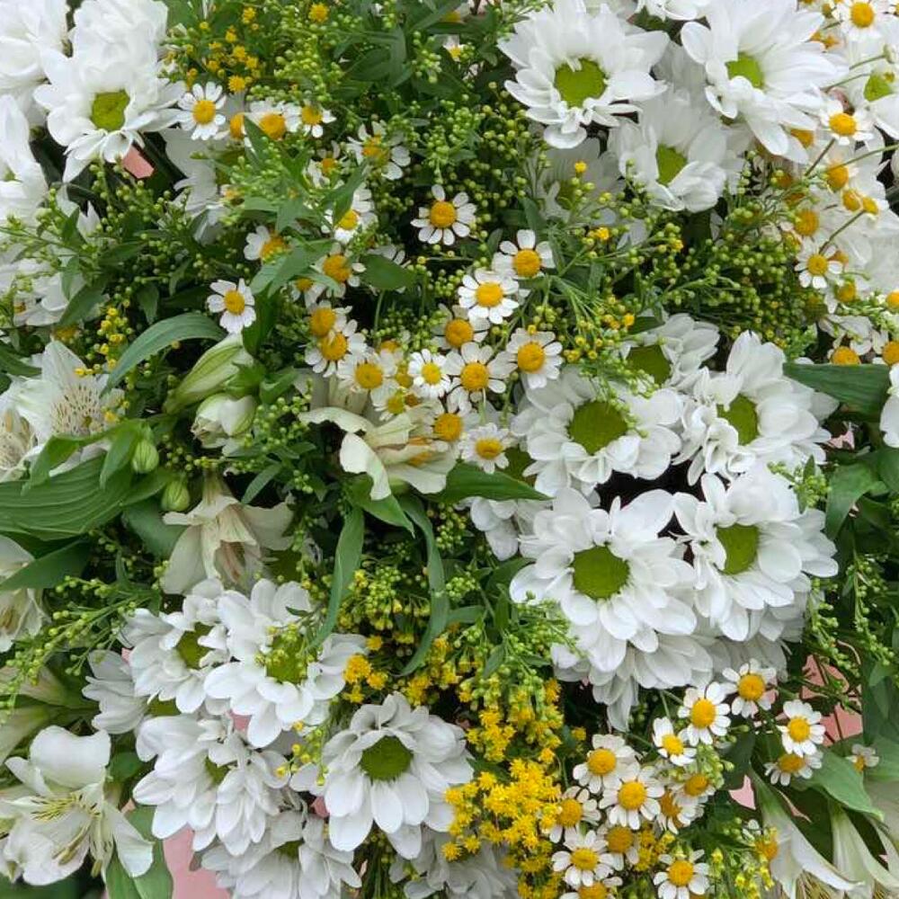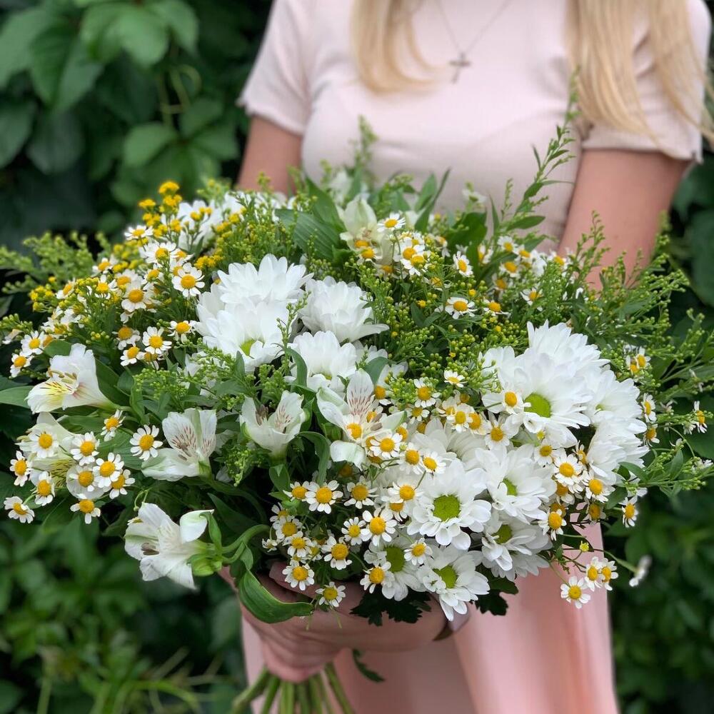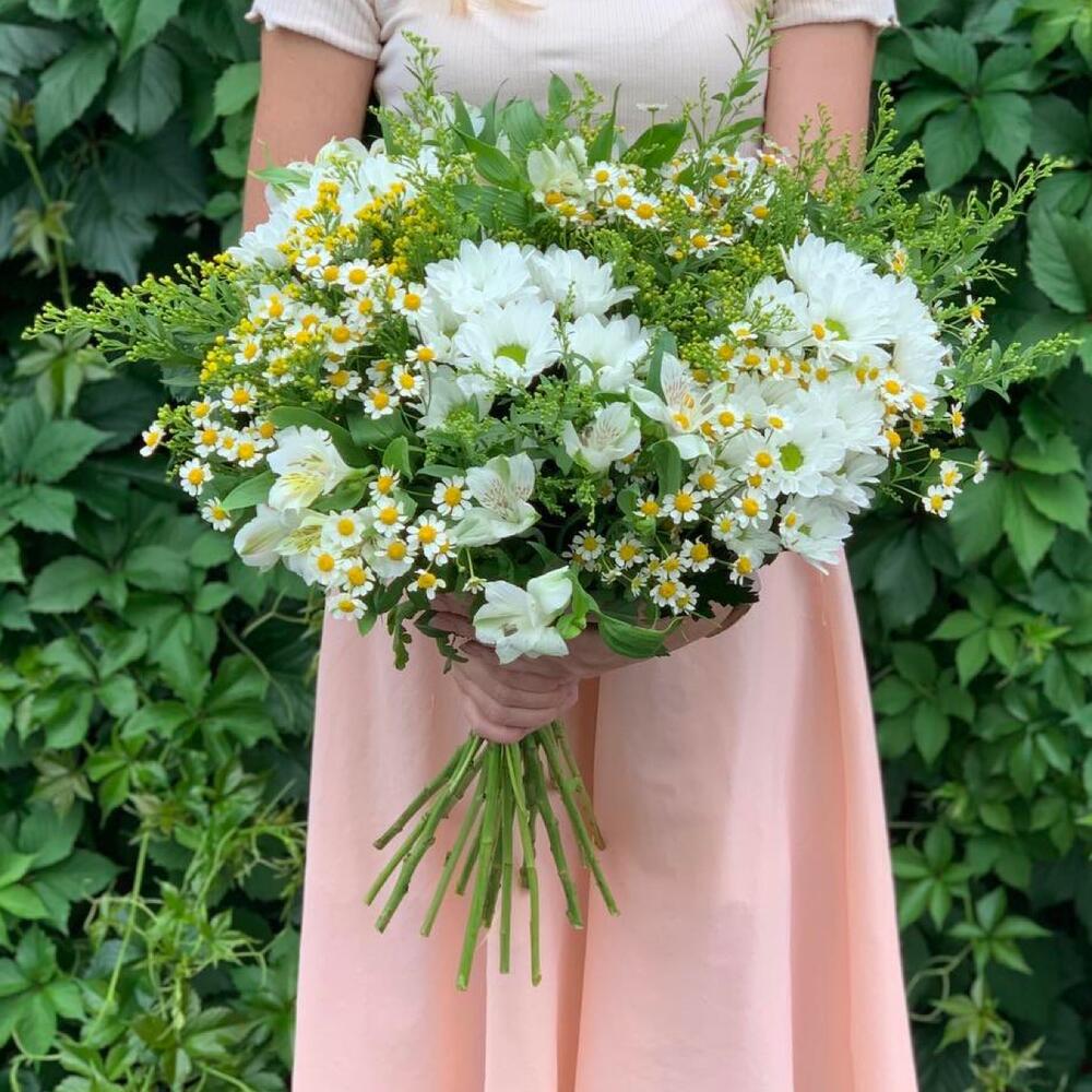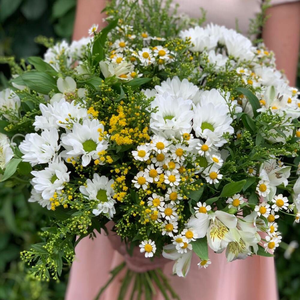 Альстромерия – 5 шт. Солидаго – 4 шт. Хризантема кустовая – 5 шт. Лента атласная – 1 шт. Green bell – 3 шт. танацетум камилла ромашка – 3 шт.