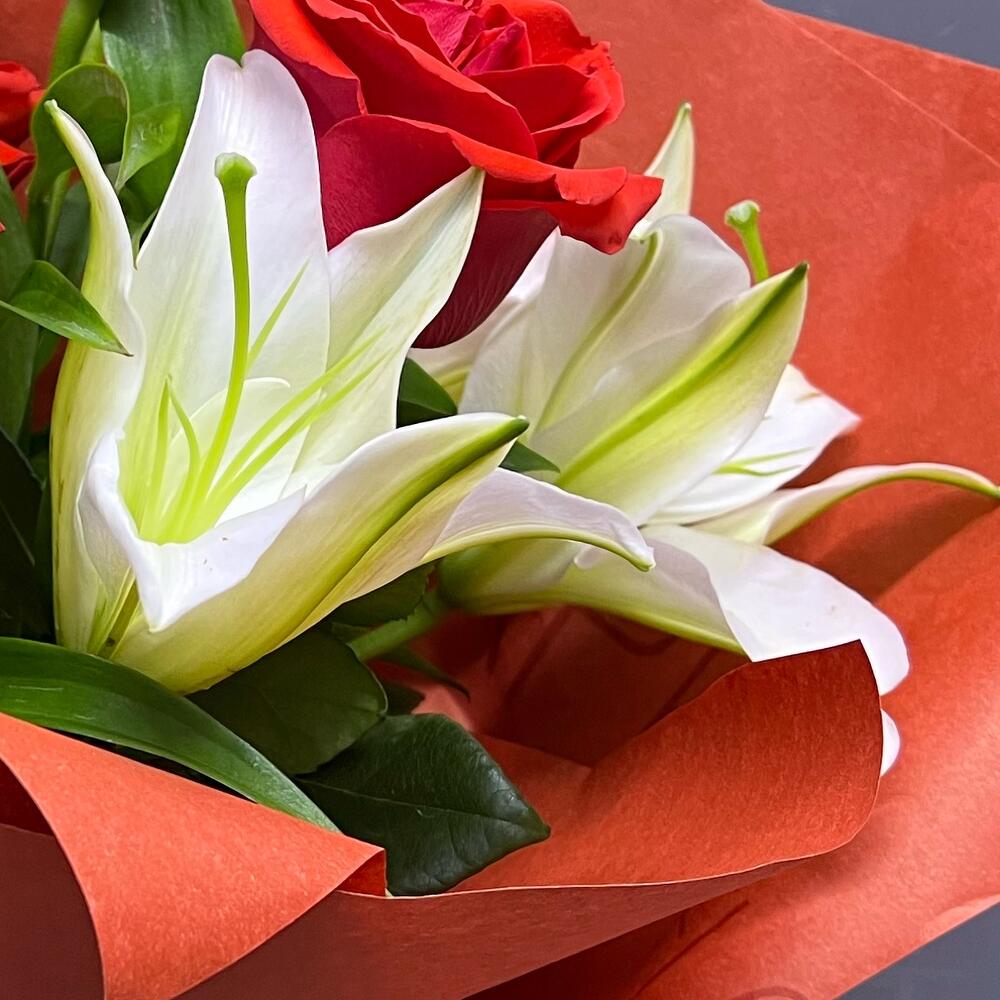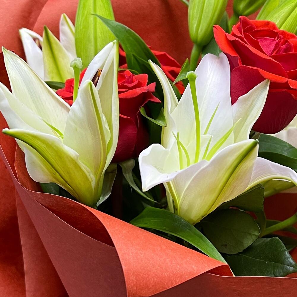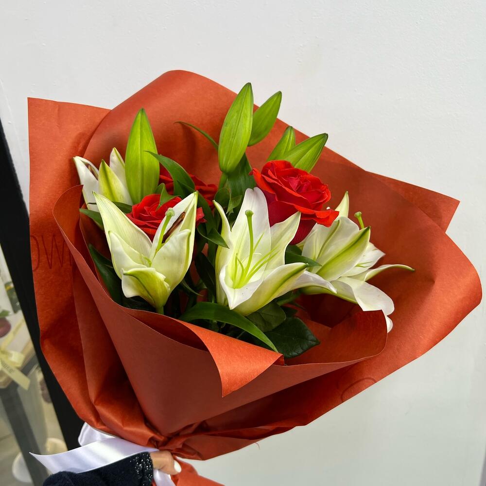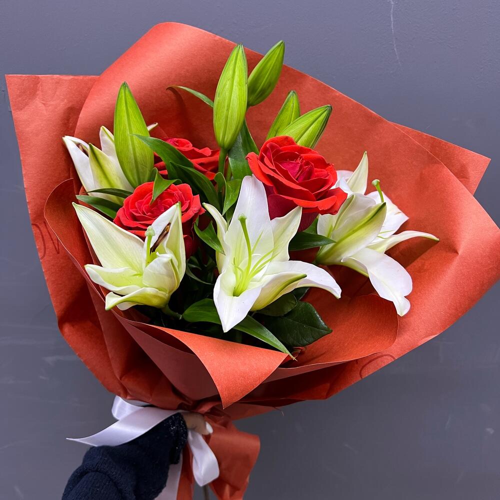 Контрастный праздничный подарочный букет с лилиями и розами!