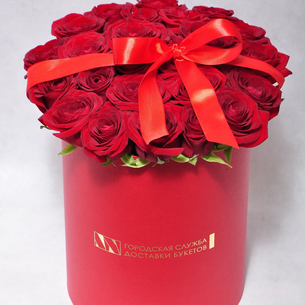 Бант – 1 шт. Пиафлор – 1 шт. Роза red naomi – 29 шт. шляпная коробка 20*25 см – 1 шт.