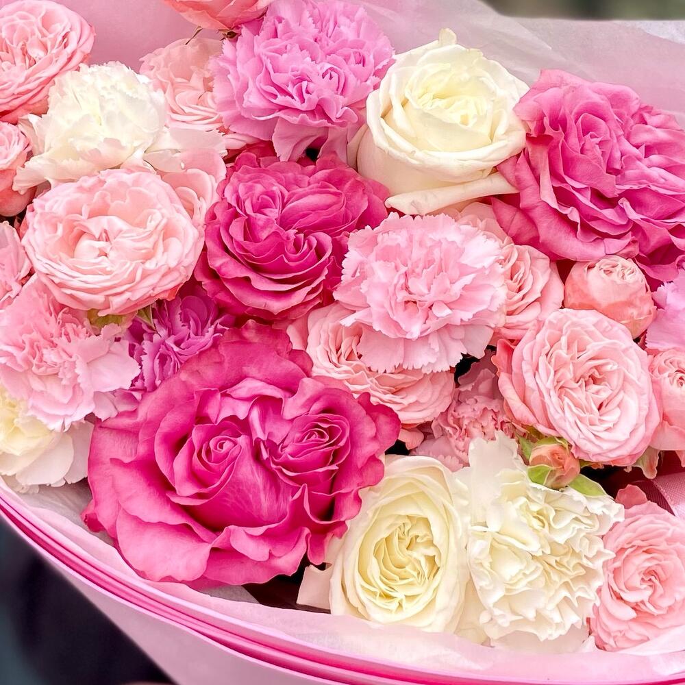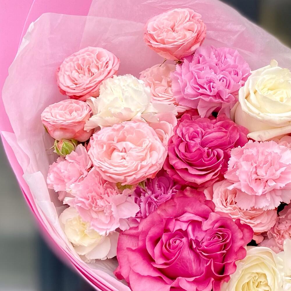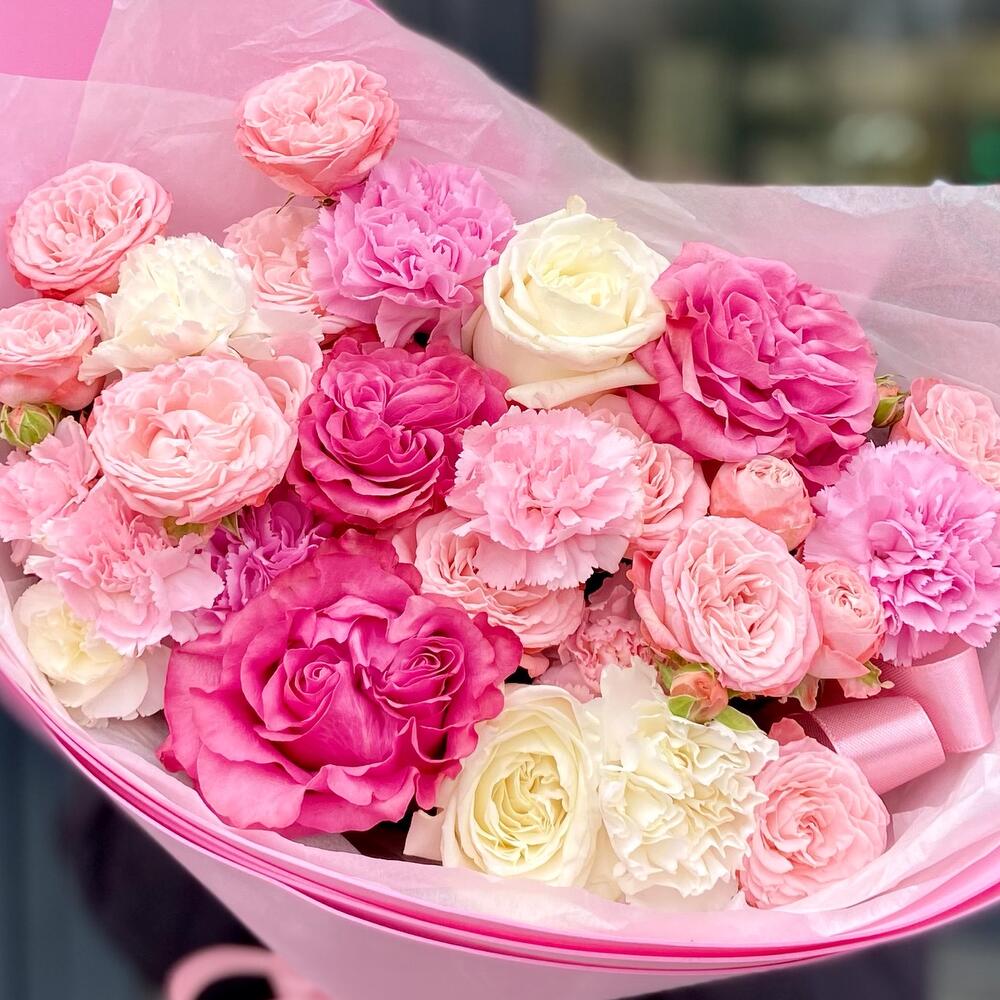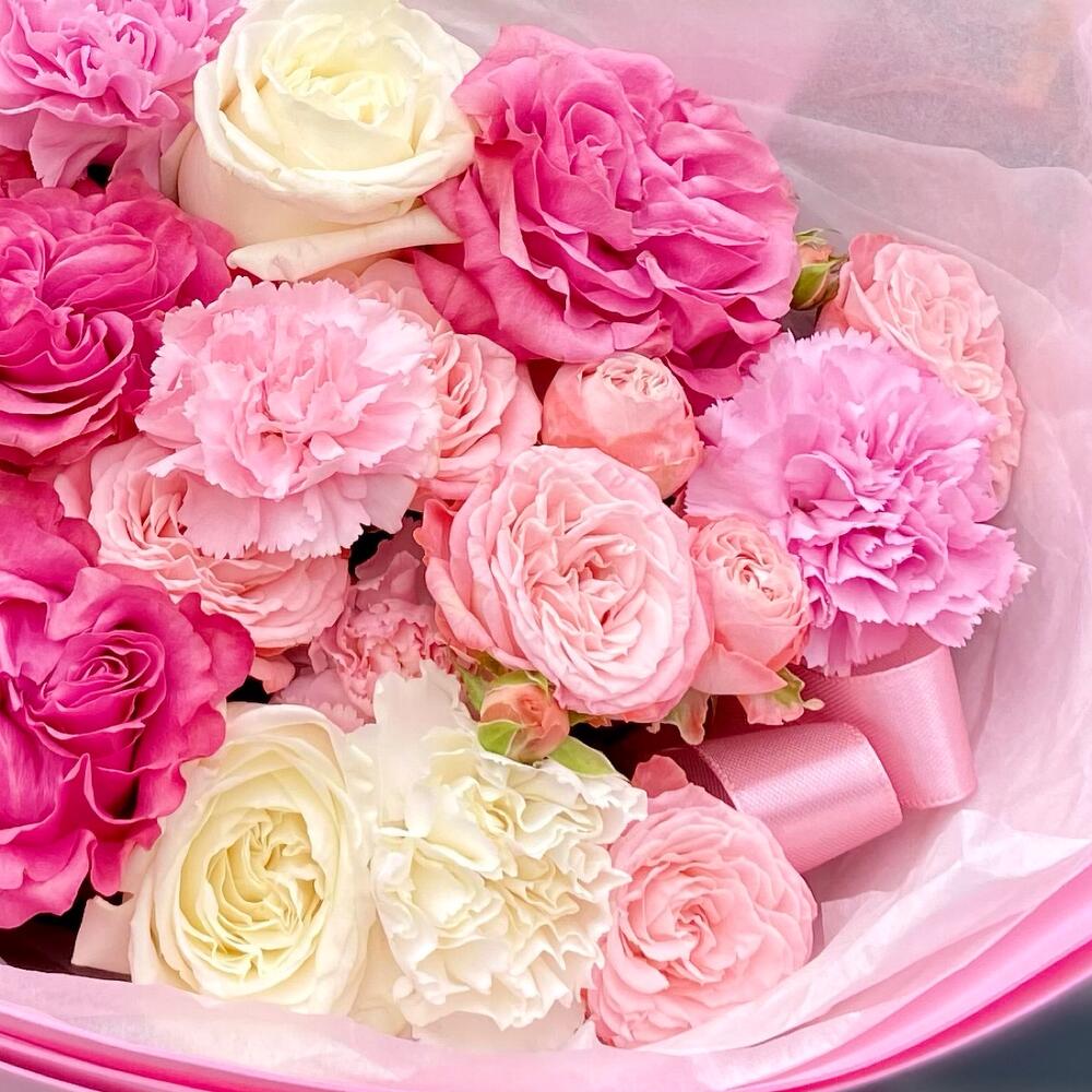 Гвоздика – 5 шт. Лента атласная – 1 шт. Гвоздика кустовая – 3 шт. Упаковка дизайнерская – 1 шт. Открыточка с вашими пожеланиями – 1 шт. Бомбастик – 3 шт. кантри блю – 3 шт. плайя бланка роза – 2 шт.