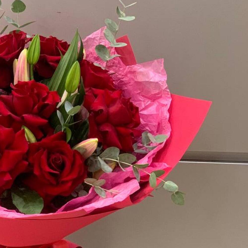 Лилия - 2 шт. Лента атласная - 1 шт. Роза Софи Лорен - 9 шт. Упаковка дизайнерская - 1 шт.