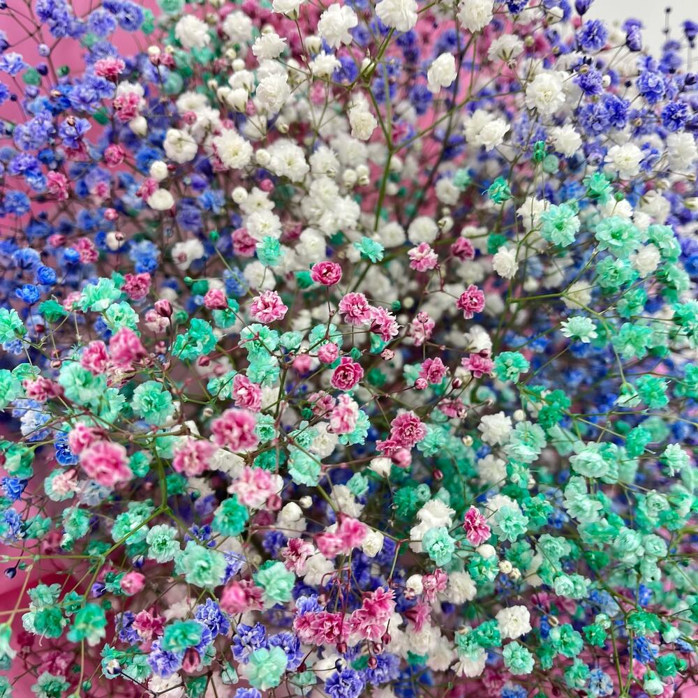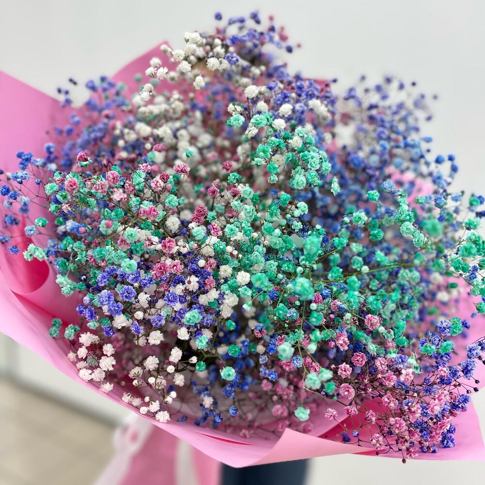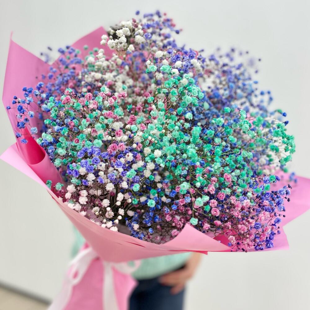 Лента атласная - 2 шт. Упаковка дизайнерская - 2 шт. гипсофила радужная - 7 шт.
