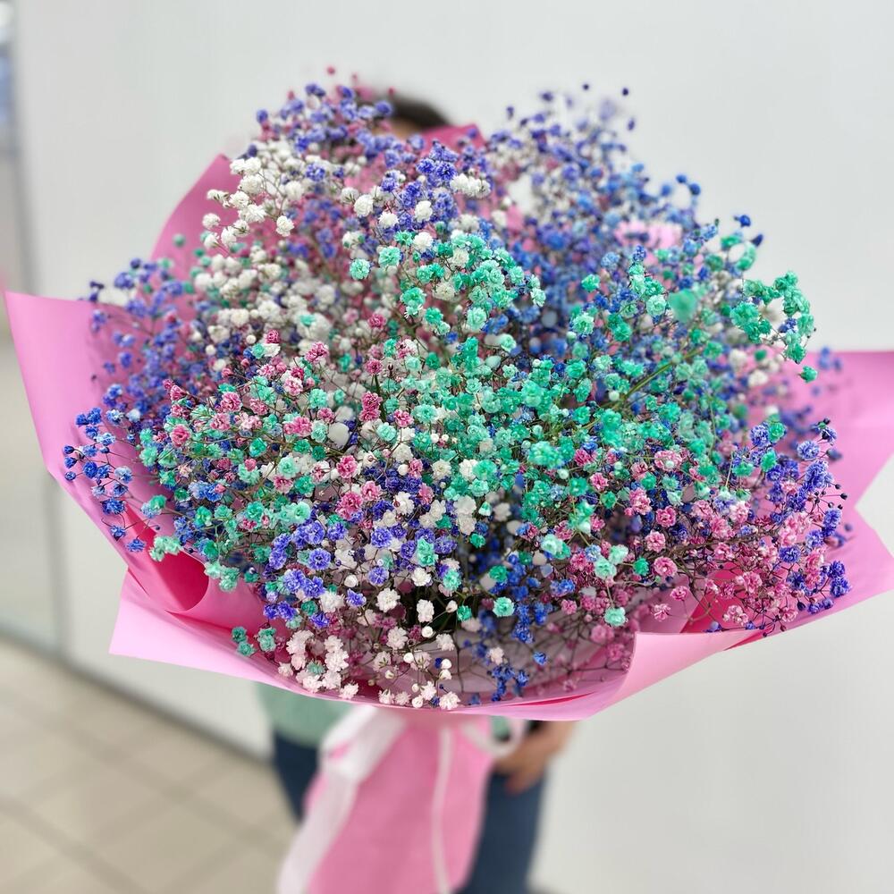 Лента атласная – 2 шт. Упаковка дизайнерская – 2 шт. гипсофила радужная – 7 шт.