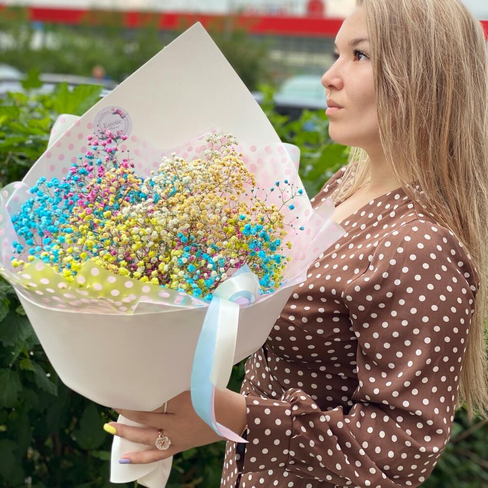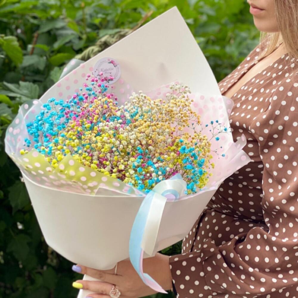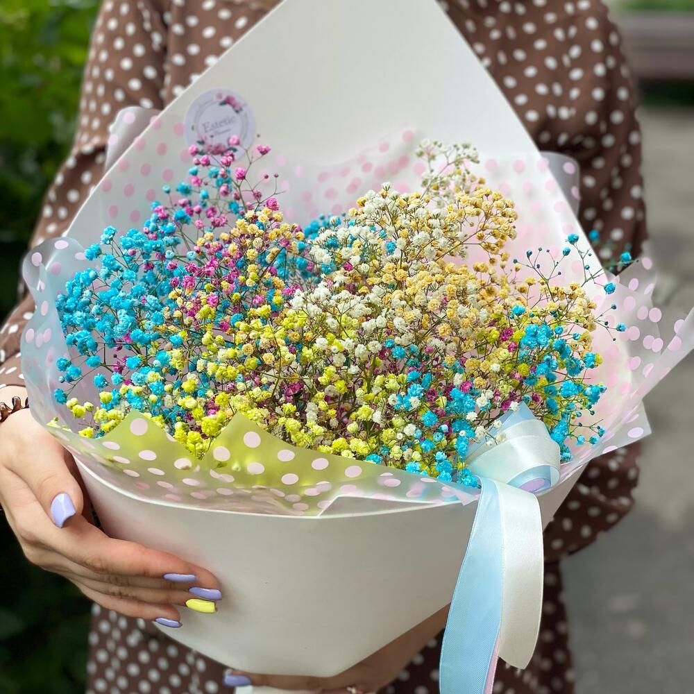 Радужные шарики разноцветной гипсофилы будут радовать получателя долго✨