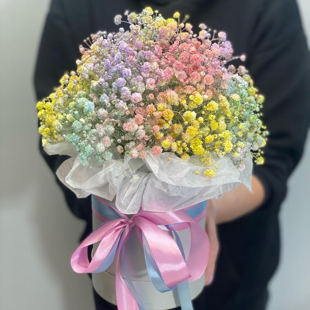 Коробка из гипсофилы – это всегда универсальный подарок, который можно подарить практически по любому поводу. Будь то день рождения или свидание, либо если Вы просто хотите напомнить о себе ☺️А так же букет в шляпной коробке – это еще и удобно, ведь не нужно думать куда поставить цветы, достаточно просто периодически подливать воду на флористическую губку, в которой стоит композиция из цветов Гипсофила один из самых стойких цветов, которые впоследствии очень удобно становятся сухоцветом и совсем не теряют своего внешнего вида, благодаря чему веточки гипсофилы можно использовать дома в качестве предмета интерьера 🏠