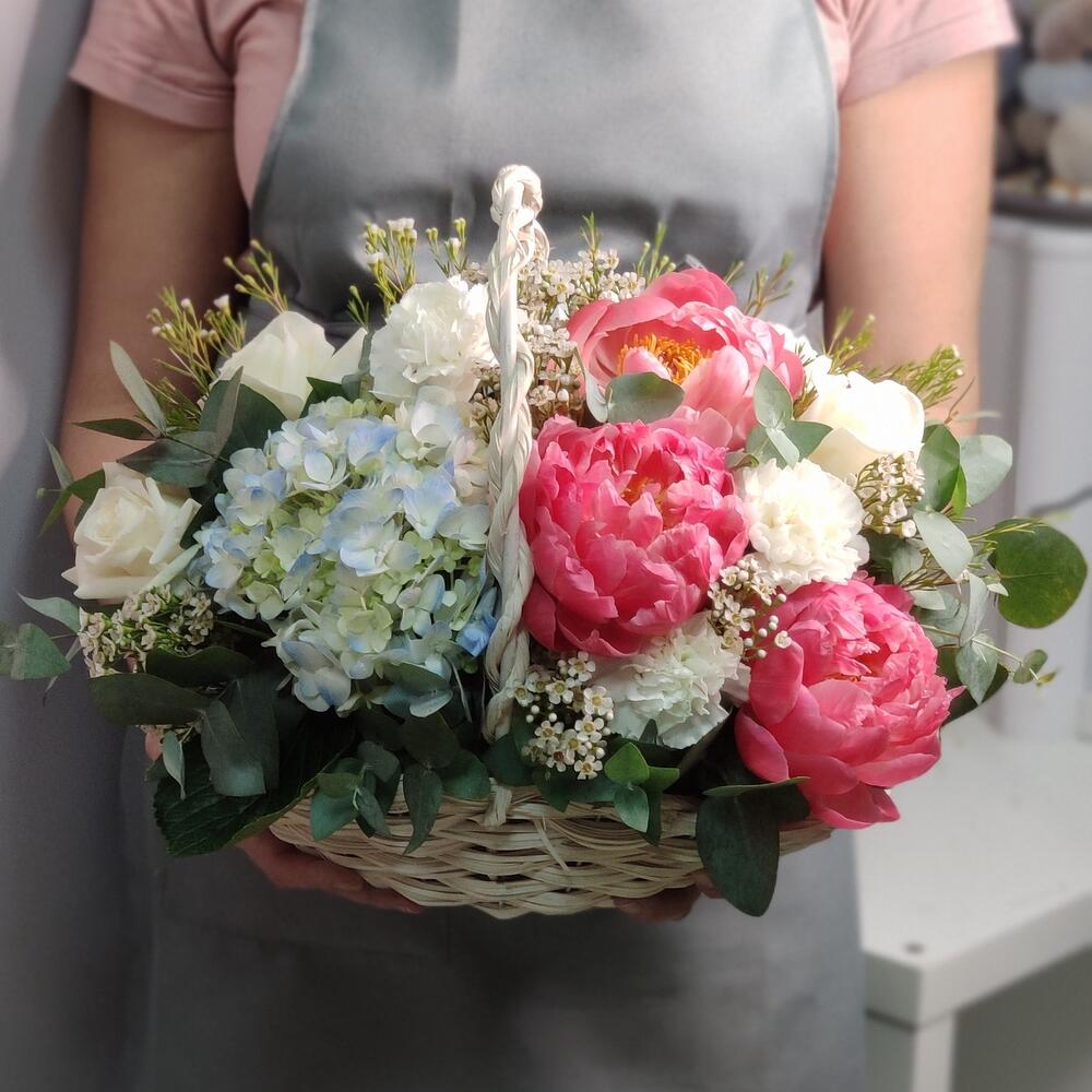 Стильная корзина с коралловыми пионами и голубой гортензией способна выразить ваши самые сильные чувства. Интересное цветовое сочетание актуально в этом сезоне.