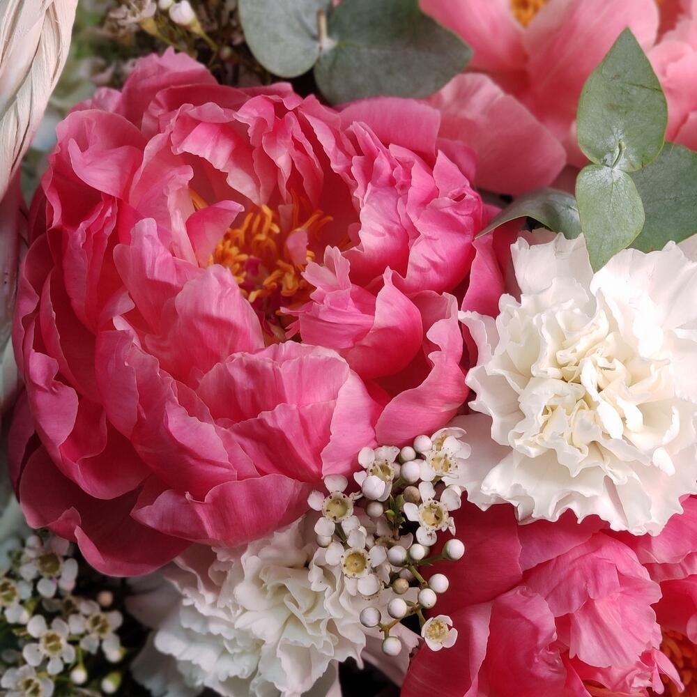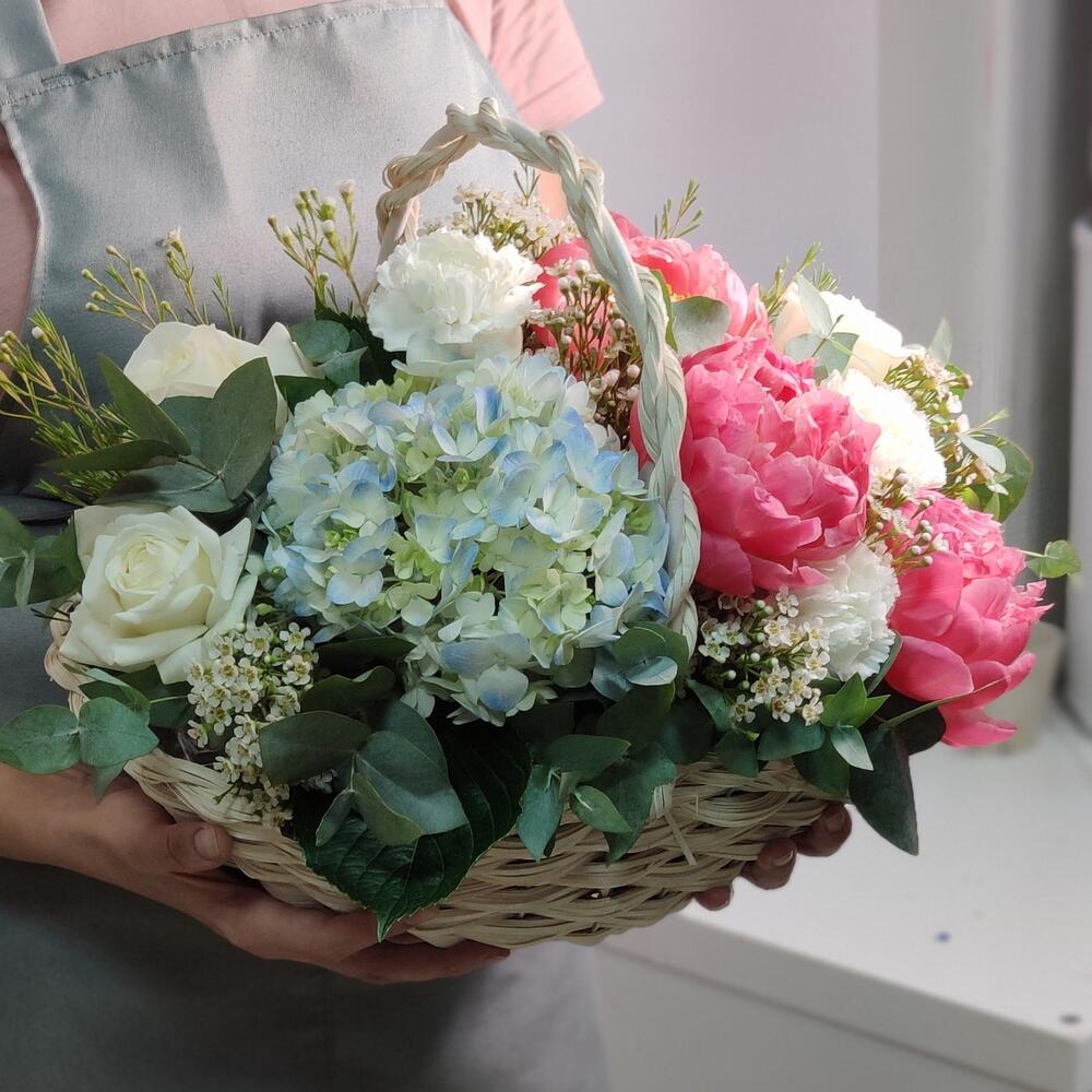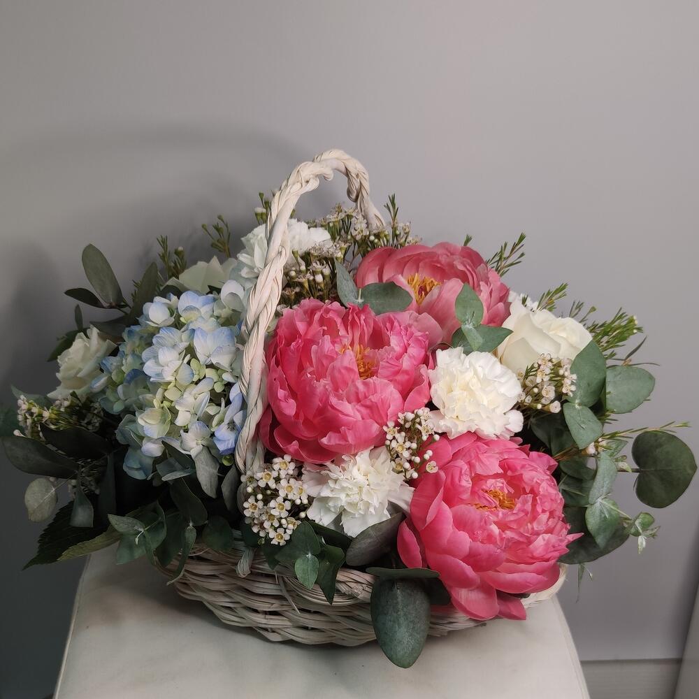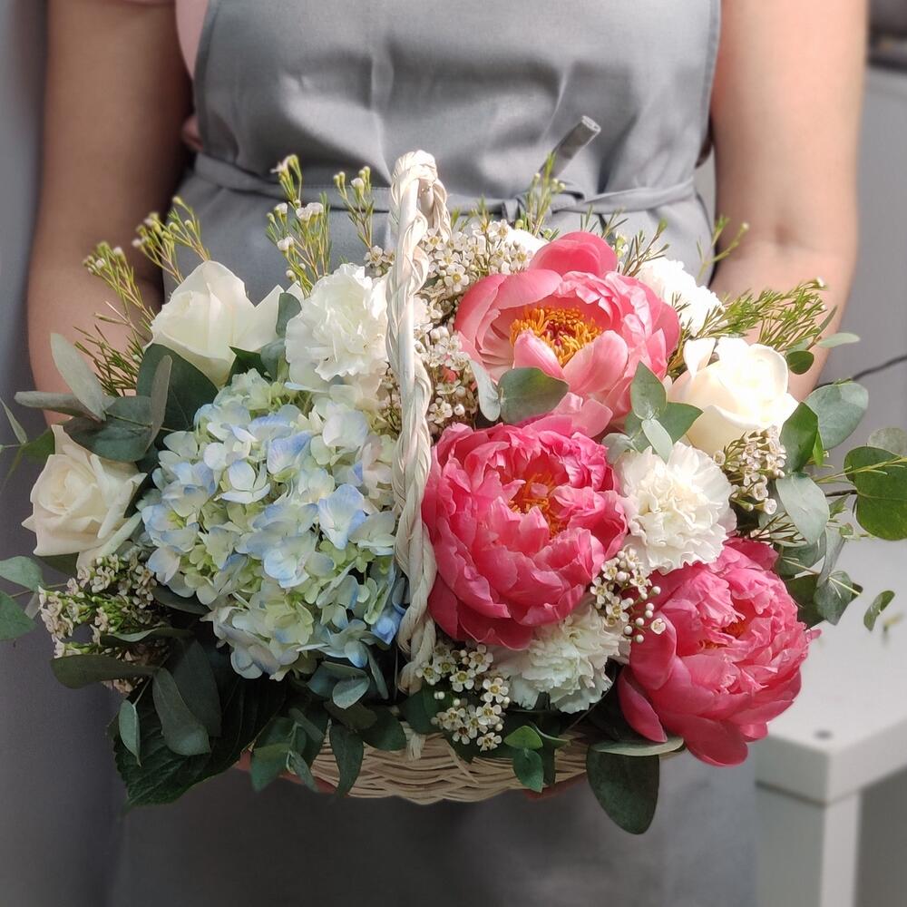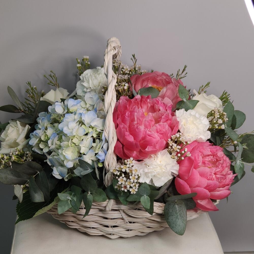 Ваксфлауэр - 3 шт. Корзина плетеная - 1 шт. Гортензия голубая - 1 шт. Диантус белый - 6 шт. Эвкалипт Baby Blue - 4 шт. Роза белая 50 см россия - 3 шт. Пион коралл шарм - 3 шт.