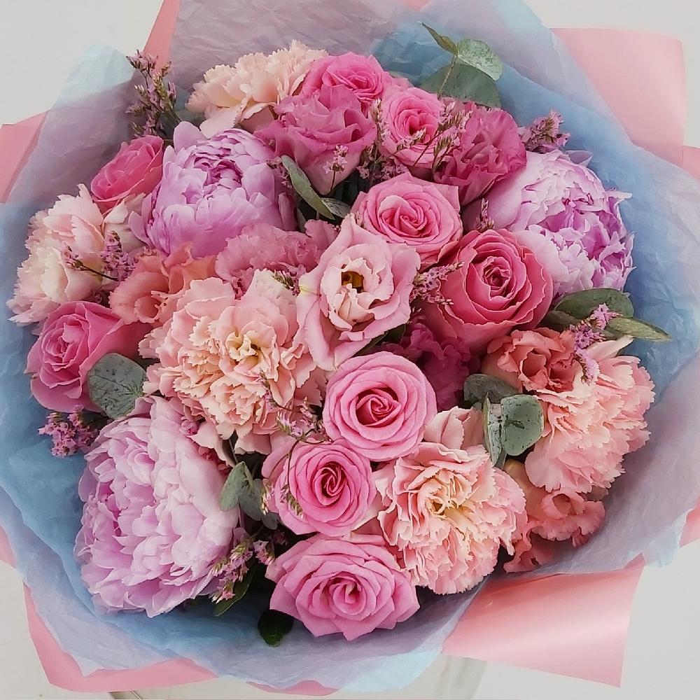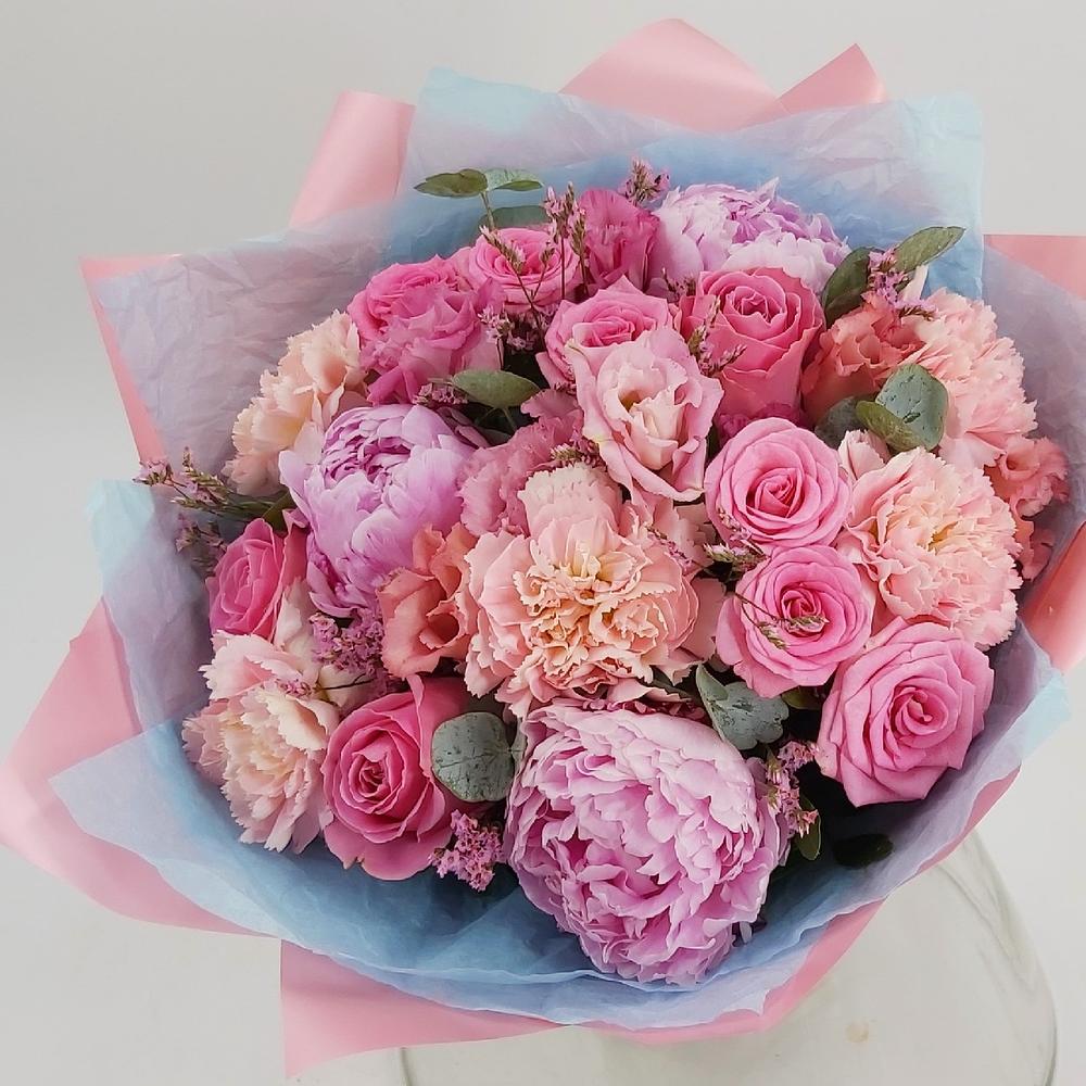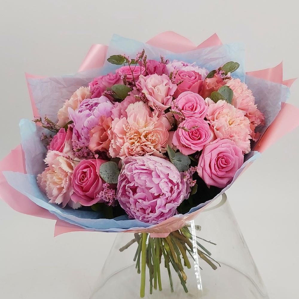 Лимониум - 4 шт. Роза кустовая - 2 шт. Эвкалипт - 6 шт. Роза одноголовая - 3 шт. Эустома - 5 шт. Лента атласная - 2 шт. Гвоздика сортовая - 5 шт. Упаковка тишью - 2 шт. Пион розовый - 3 шт. упаковка пленка матовая премиум - 3 шт.