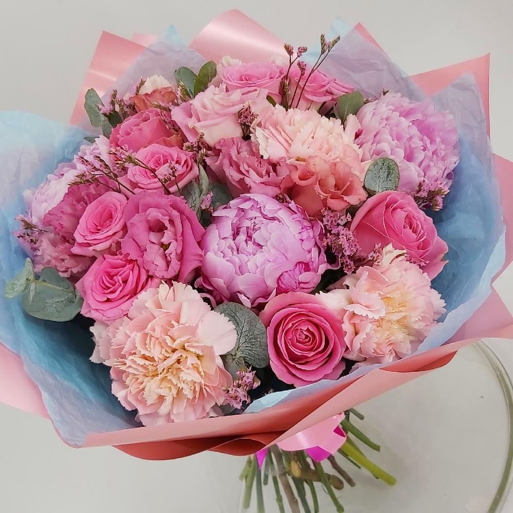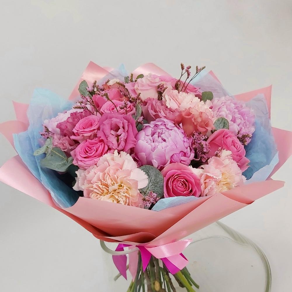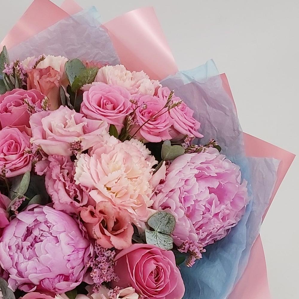 Лимониум – 4 шт. Роза кустовая – 2 шт. Эвкалипт – 6 шт. Роза одноголовая – 3 шт. Эустома – 5 шт. Лента атласная – 2 шт. Гвоздика сортовая – 5 шт. Упаковка тишью – 2 шт. Пион розовый – 3 шт. упаковка пленка матовая премиум – 3 шт.