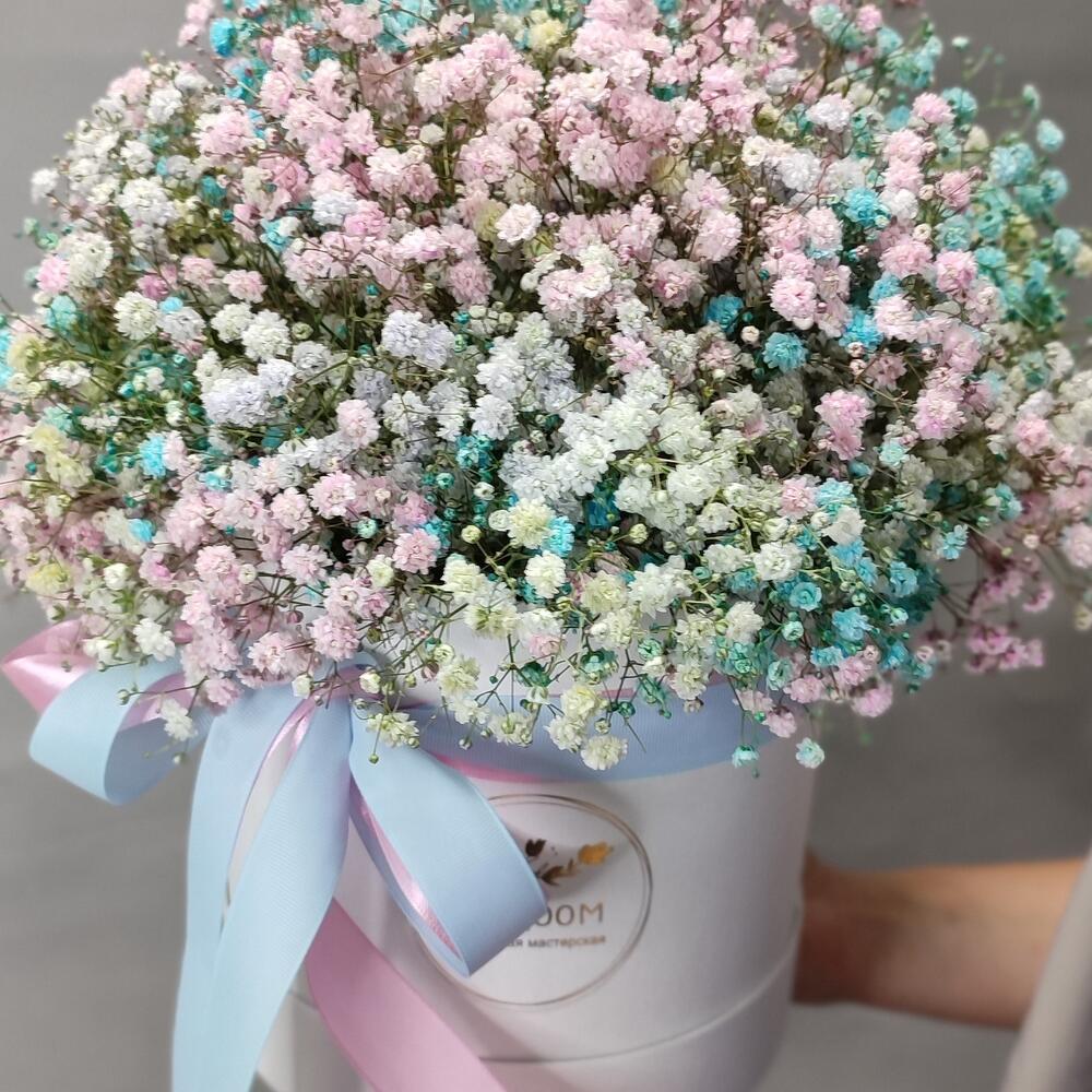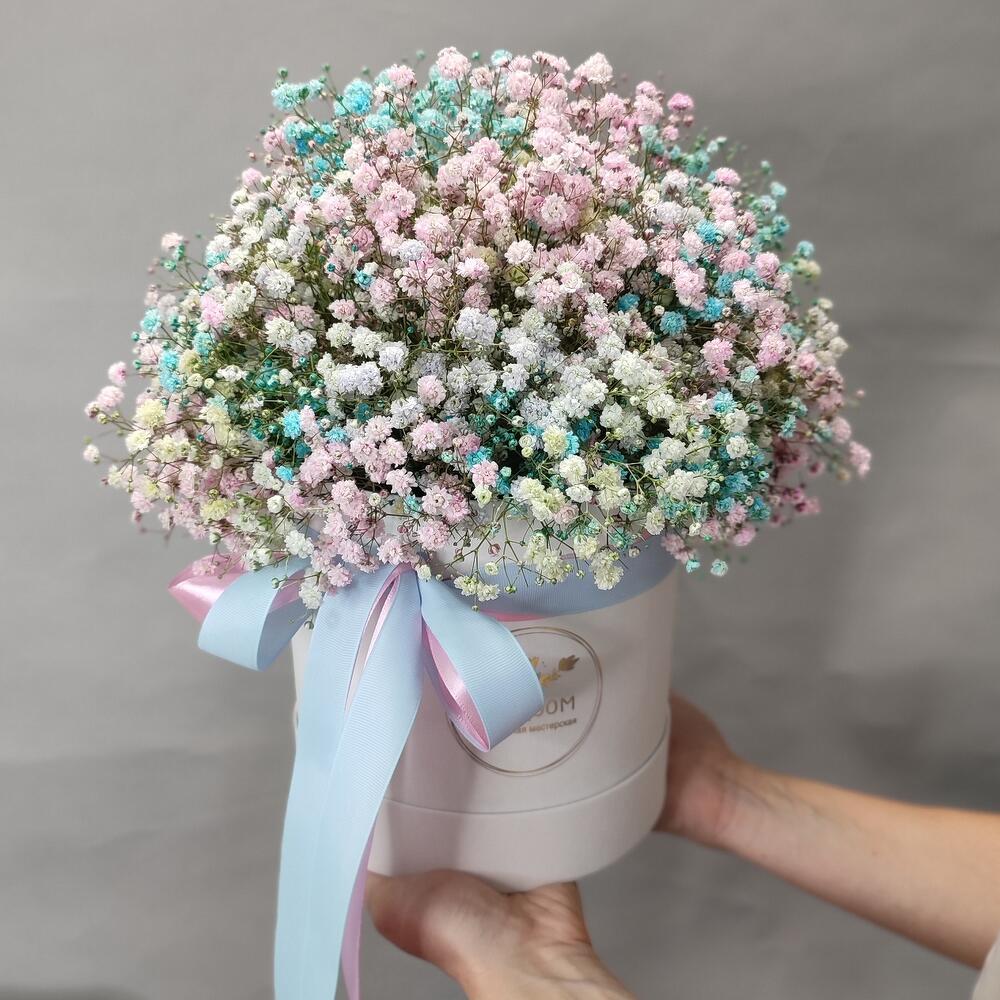 Гипсофила - 9 шт. Лента атласная - 1 шт. Коробка шляпная - 1 шт.