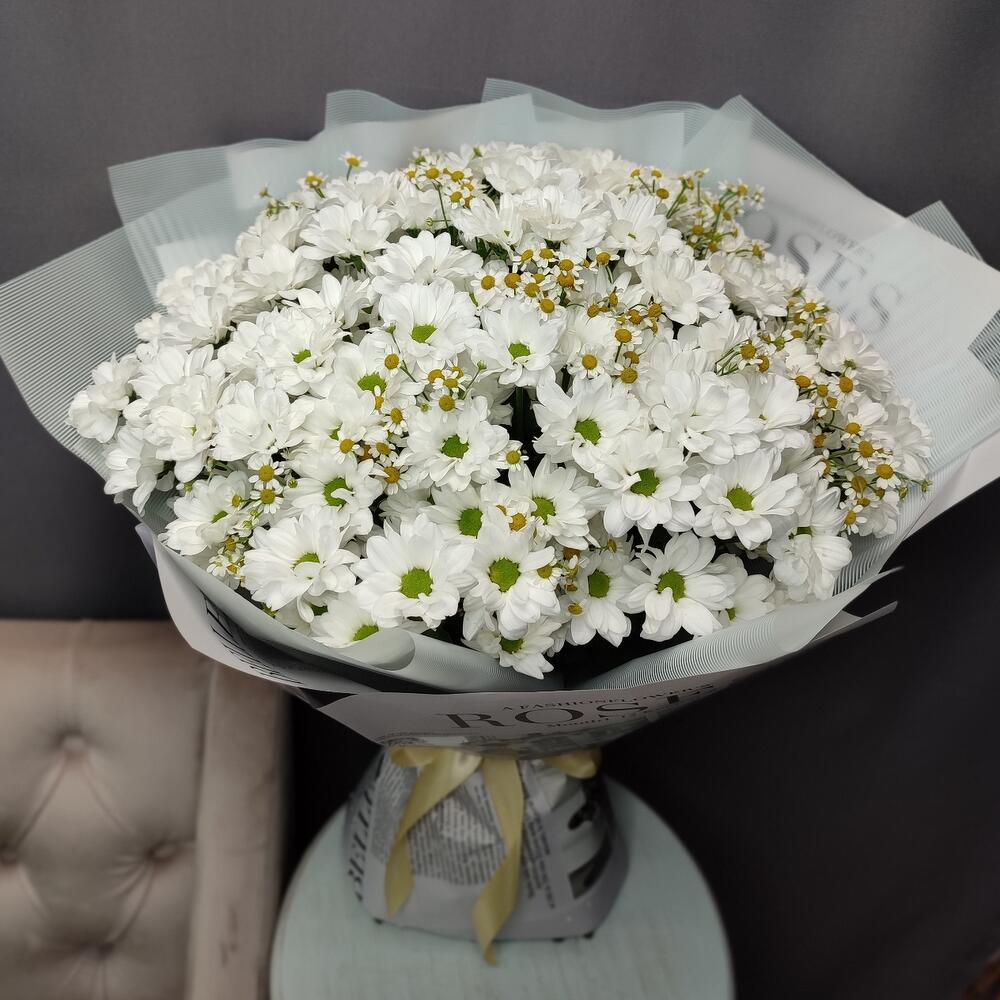 Танацетум - 7 шт. Хризантема кустовая - 15 шт. Лента атласная - 2 шт. Упаковка дизайнерская - 2 шт.