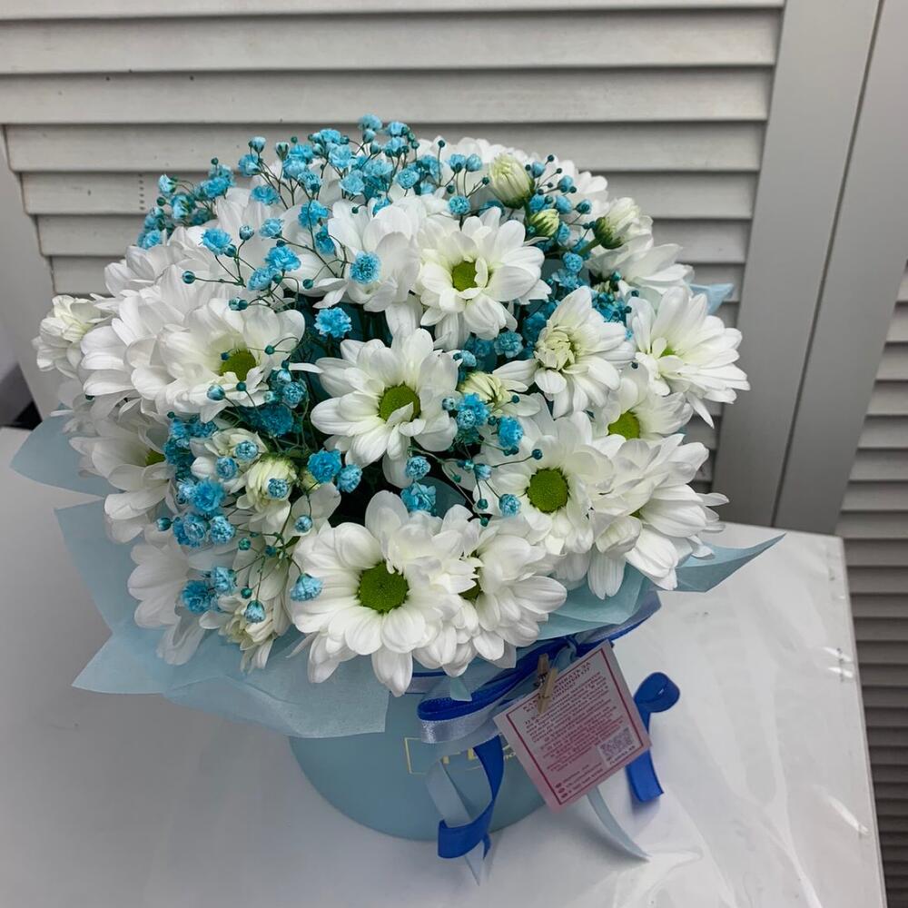 Гипсофила - 2 шт. Лента атласная - 2 шт. Коробка шляпная - 1 шт. Оазис флористический - 1 шт. хризантемы кустовые - 4 шт.