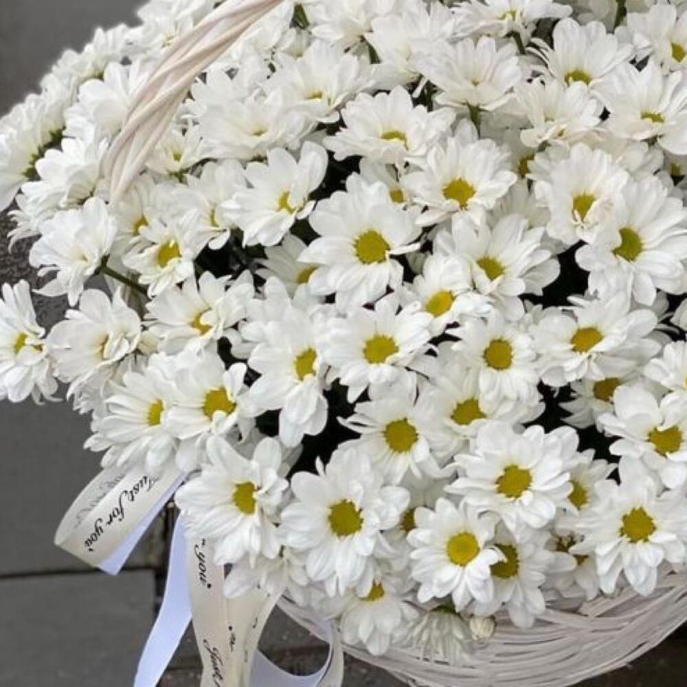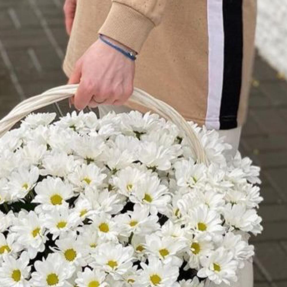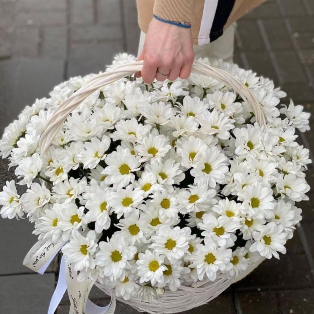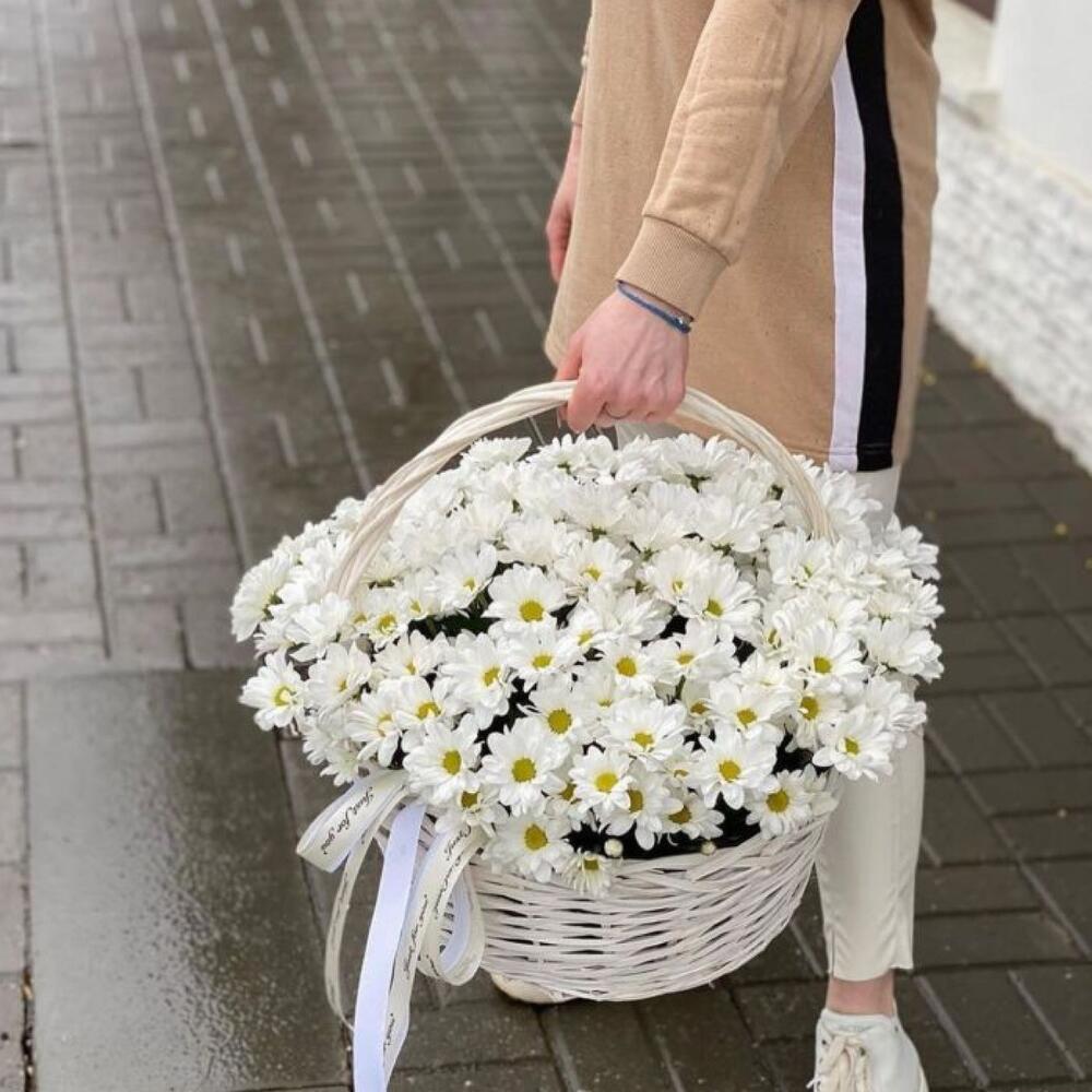 Корзина плетеная – 1 шт. Хризантема кустовая ромашковая – 20 шт. Оазис флористический – 2 шт.