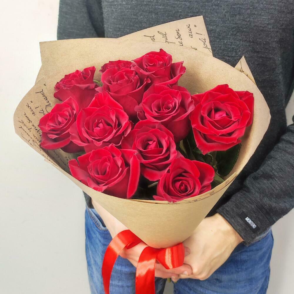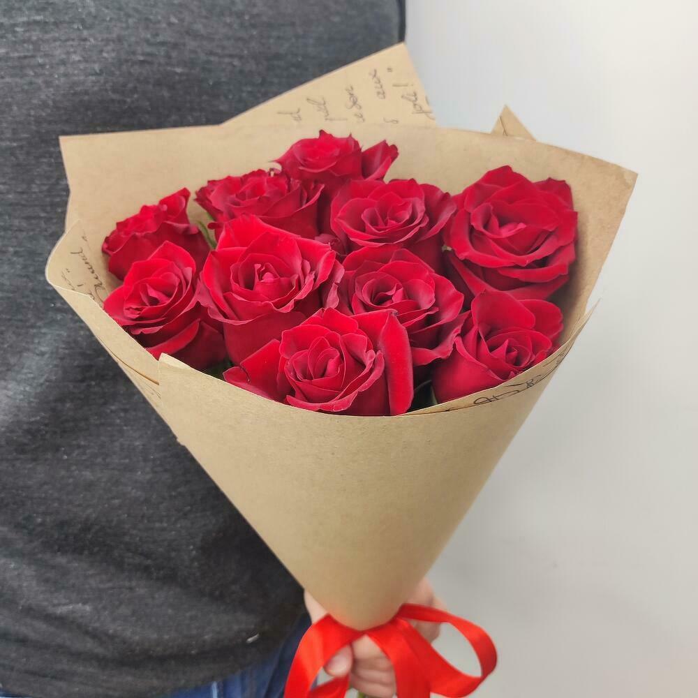 Лента атласная - 1 шт. Красная роза - 11 шт. Крафтовая упаковка - 1 шт.