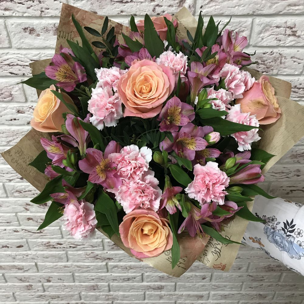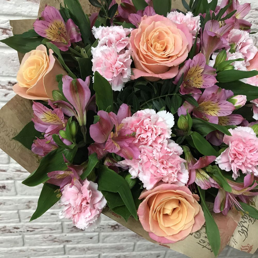 Альстромерия - 6 шт. Роза Мисс Пигги - 5 шт. Салал - 1 шт. Лента атласная - 1 шт. Кустовая гвоздика - 5 шт. Крафт - 1 шт. Пистация - 2 шт.