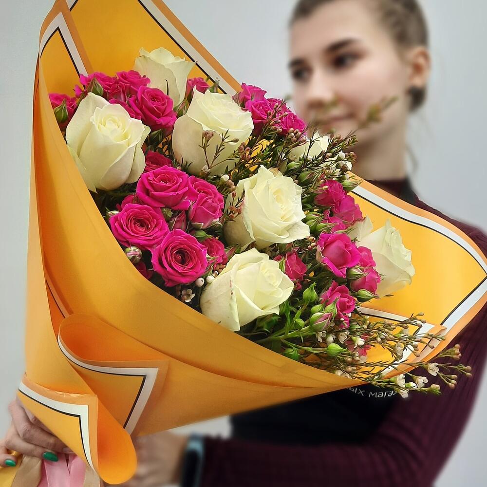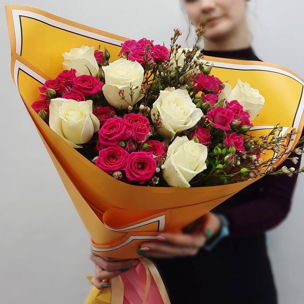 Букет сочетает в себе деликатность подобранных сочетаний цветов и очень оригинальное оформление в цветовую гамму, подчеркивает все элегантно подобранная упаковка.
