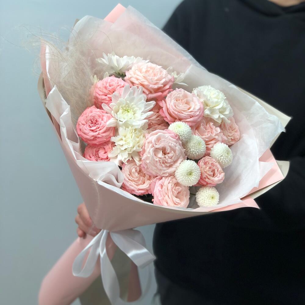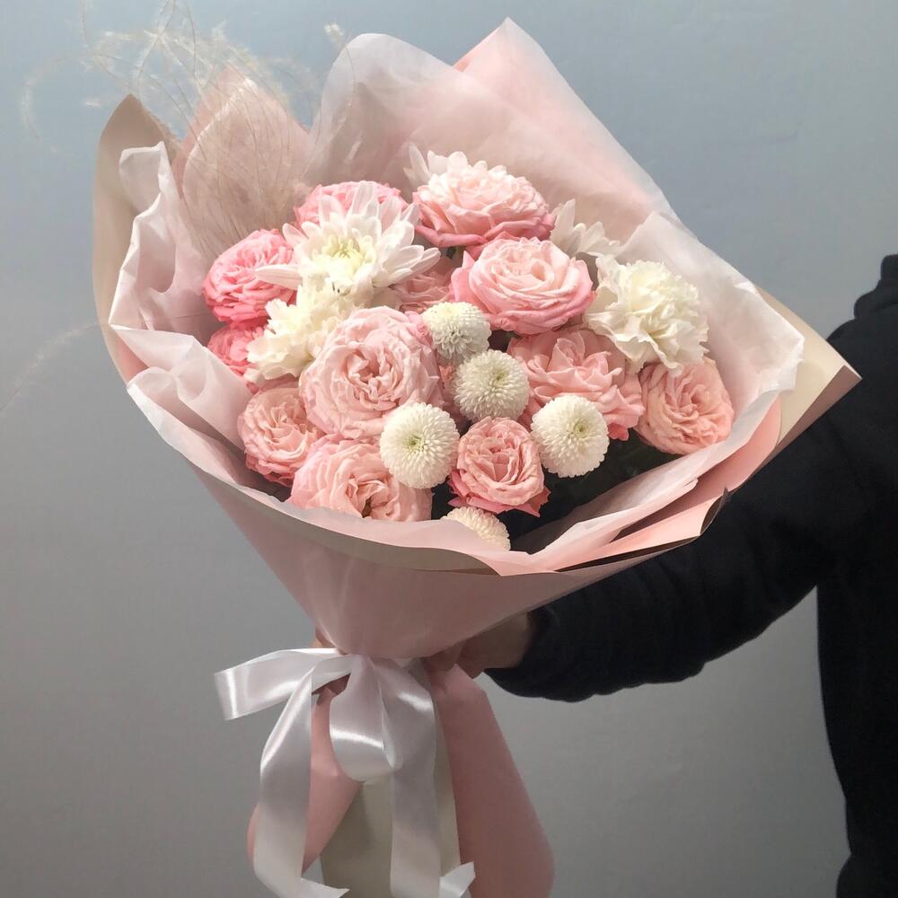Роза кустовая - 4 шт. Хризантема кустовая - 2 шт. Гвоздика - 2 шт. Упаковка дизайнерская - 3 шт. Стифа - 1 шт.