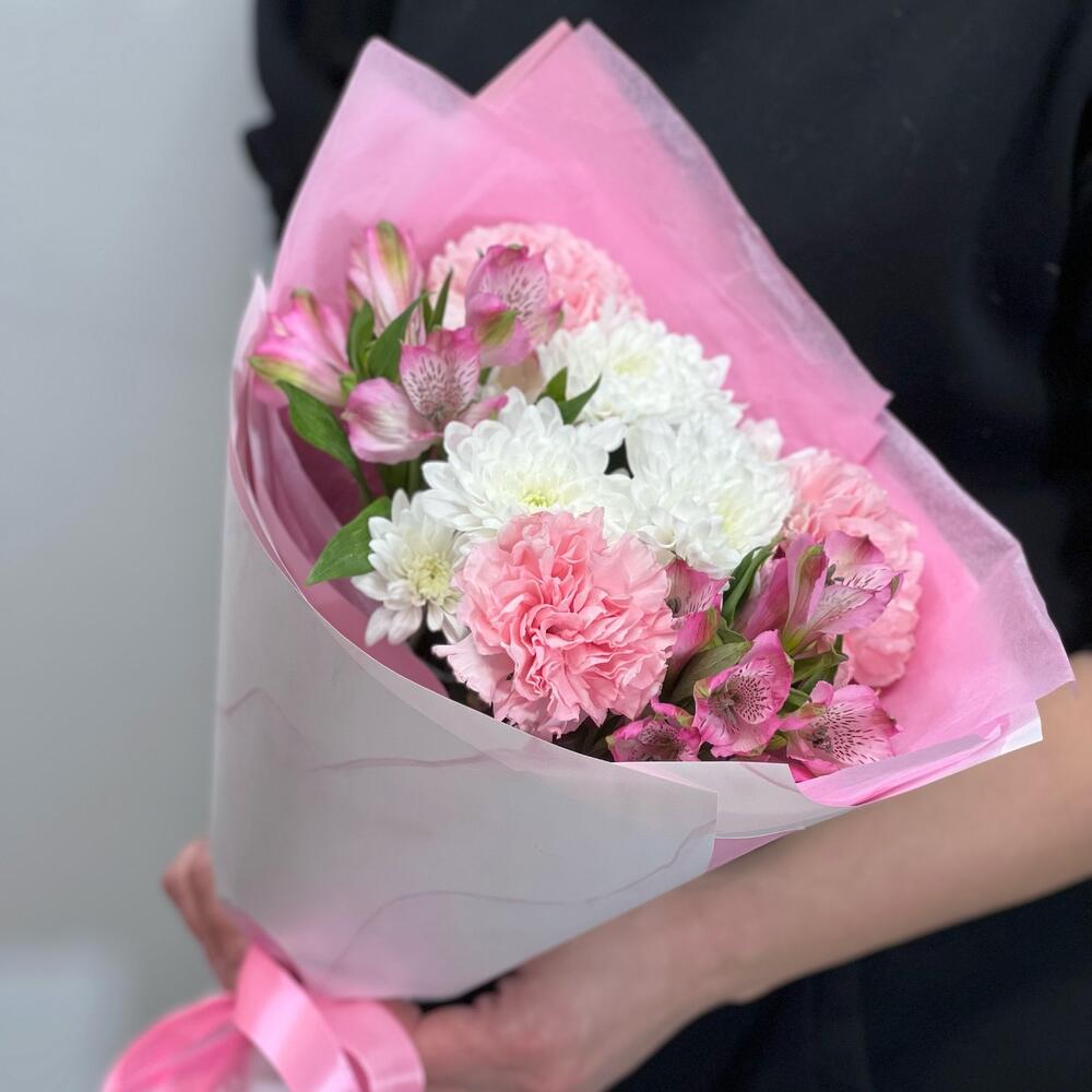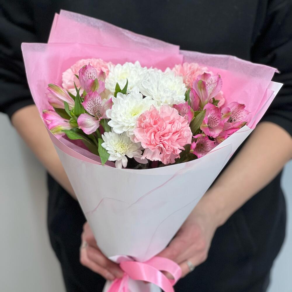Альстромерия – 2 шт. Хризантема кустовая – 1 шт. Диантус – 3 шт. Оформление – 1 шт.