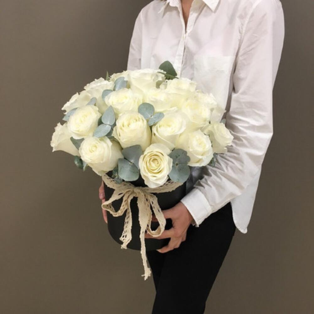 Эвкалипт - 1 шт. Роза Эквадор - 21 шт. Шляпная коробка - 1 шт.