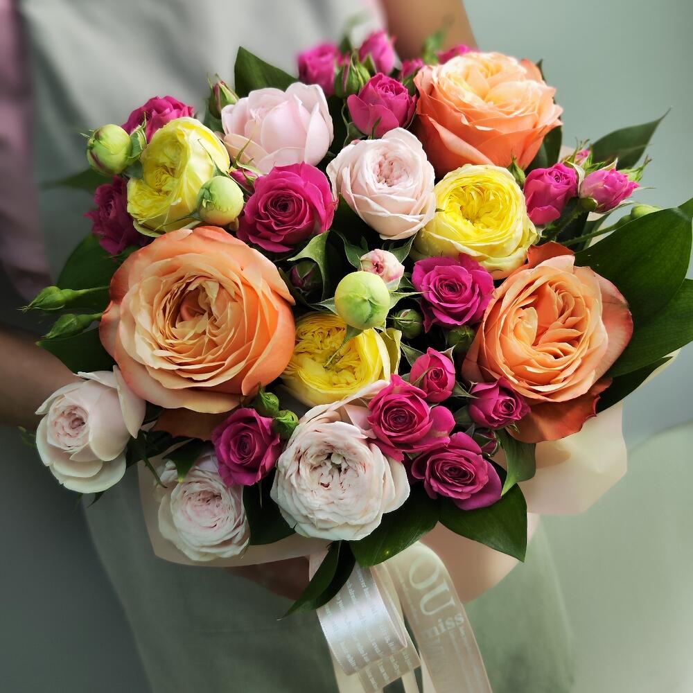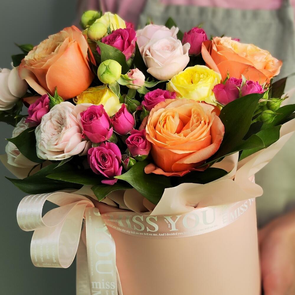 Микс из роз в коробке в оформлении зеленью рускуса. К букету Вы можете заказать набор косметики, мягкую игрушку или шары.