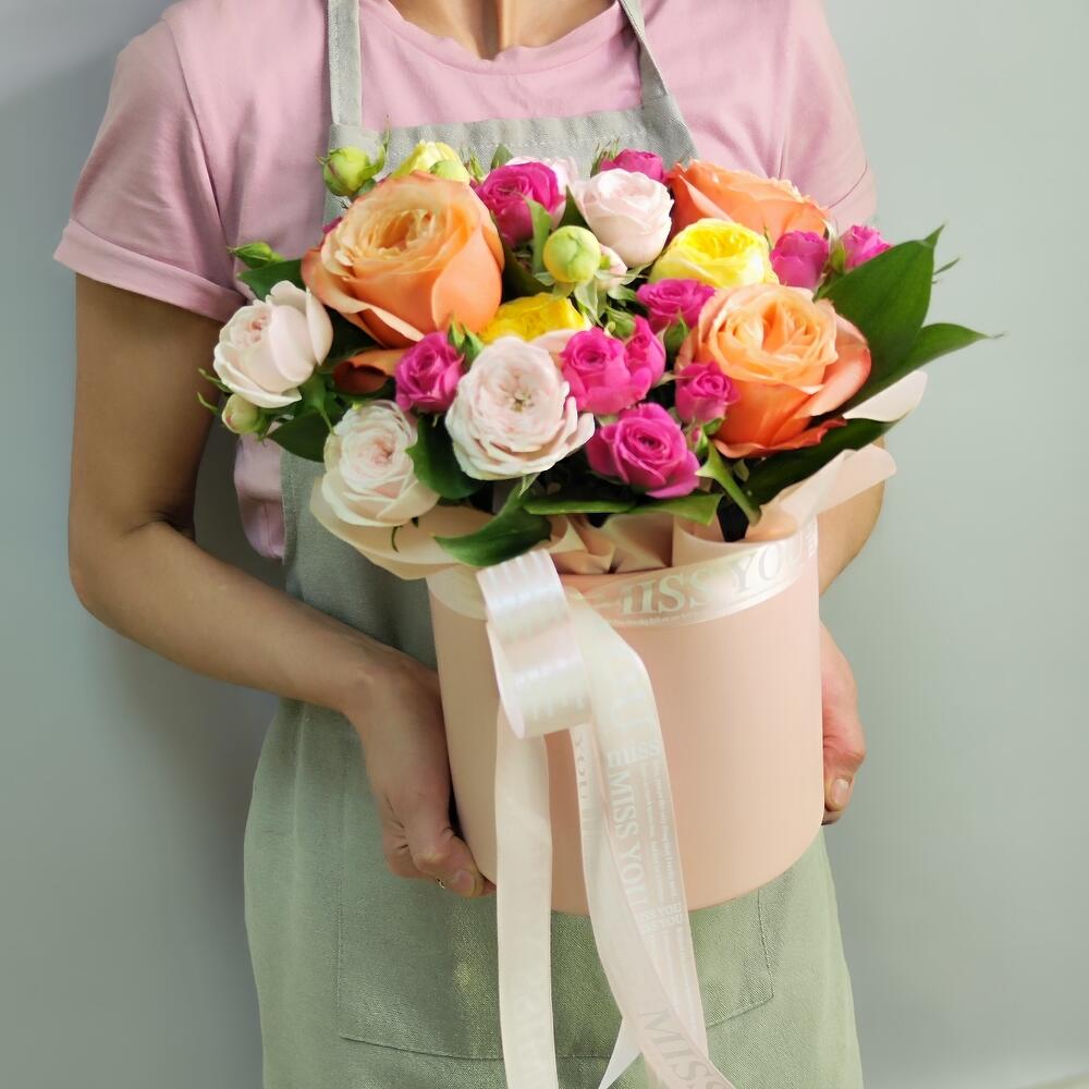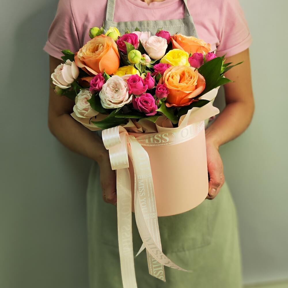 Коробка шляпная – 1 шт. Рускус сочи – 7 шт. Кустовая малиновая роза – 2 шт. Роза пионовидная кахала – 3 шт. роза кустовая пионовидная желтая – 1 шт. лента с надписью – 1 шт. пленка персиковая – 1 шт. кустовая пионовидная роза розовая роза – 1 шт.