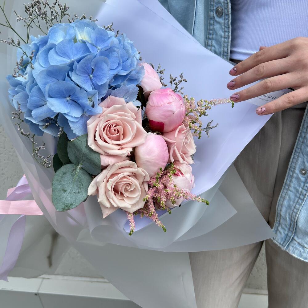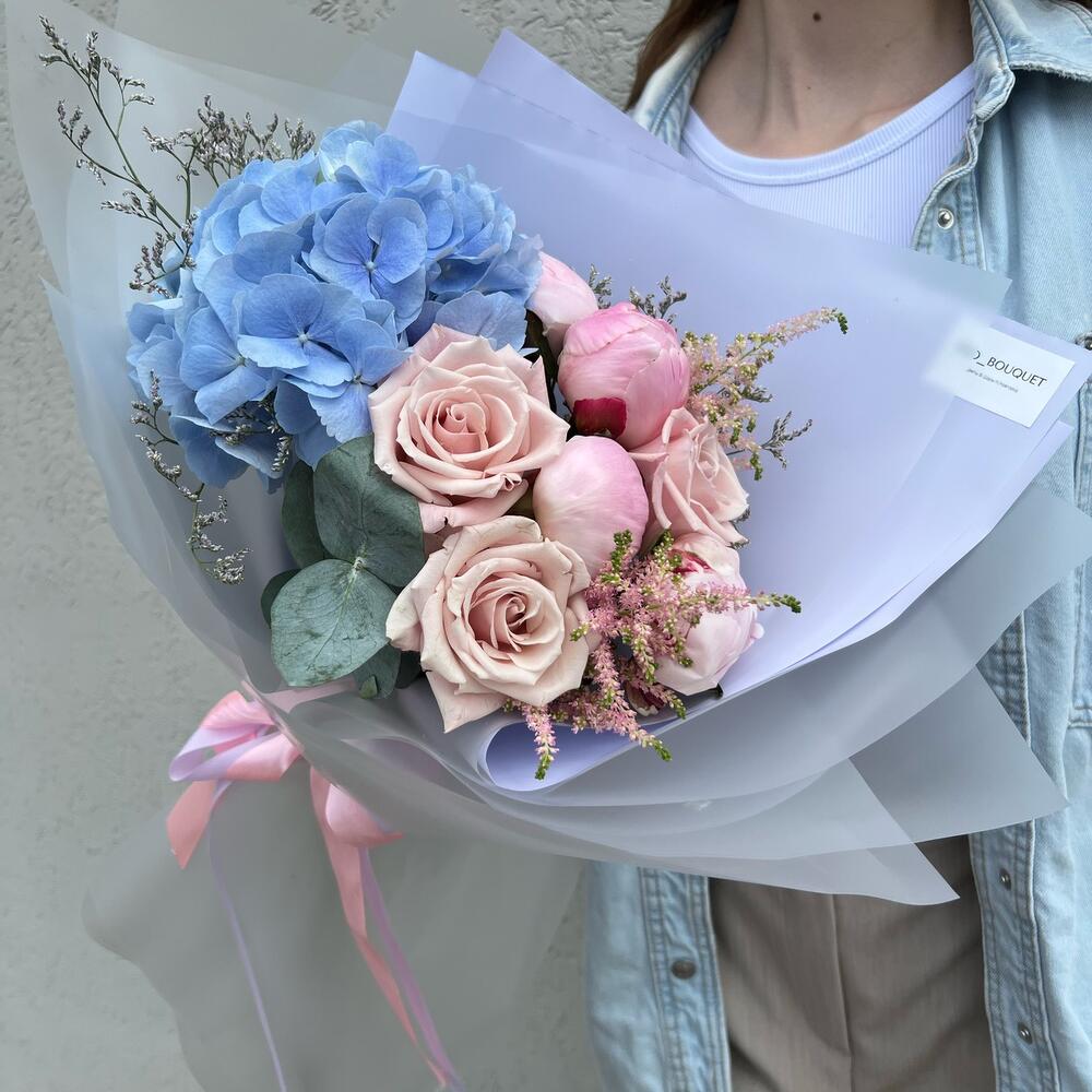 Астильба - 2 шт. Гортензия - 1 шт. Лента - 1 шт. Лимониум - 1 шт. Пион - 4 шт. Эвкалипт - 1 шт. Роза Эквадор - 3 шт. Упаковка - 1 шт.