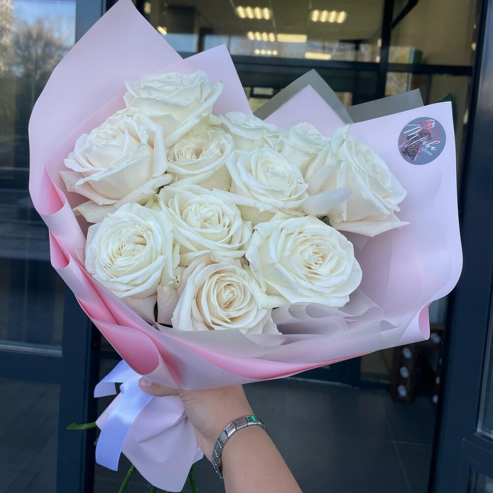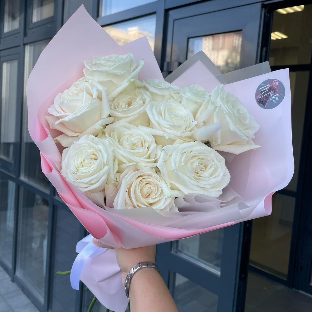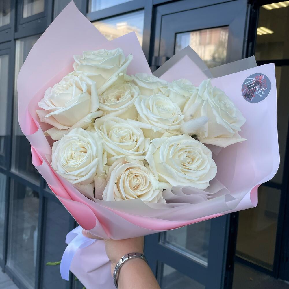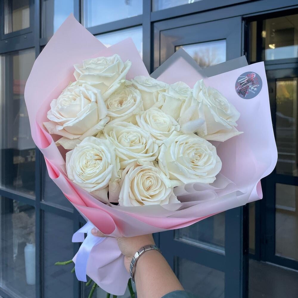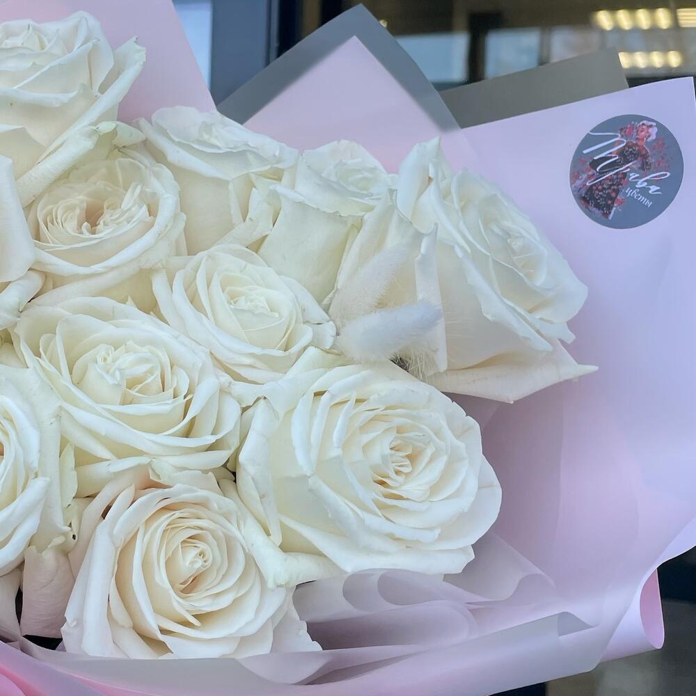 Лента атласная - 1 шт. Пионовидная роза - 11 шт. Упаковка дизайнерская - 1 шт. Открыточка с вашими пожеланиями - 1 шт. Лагурус (сухоцвет) - 3 шт.