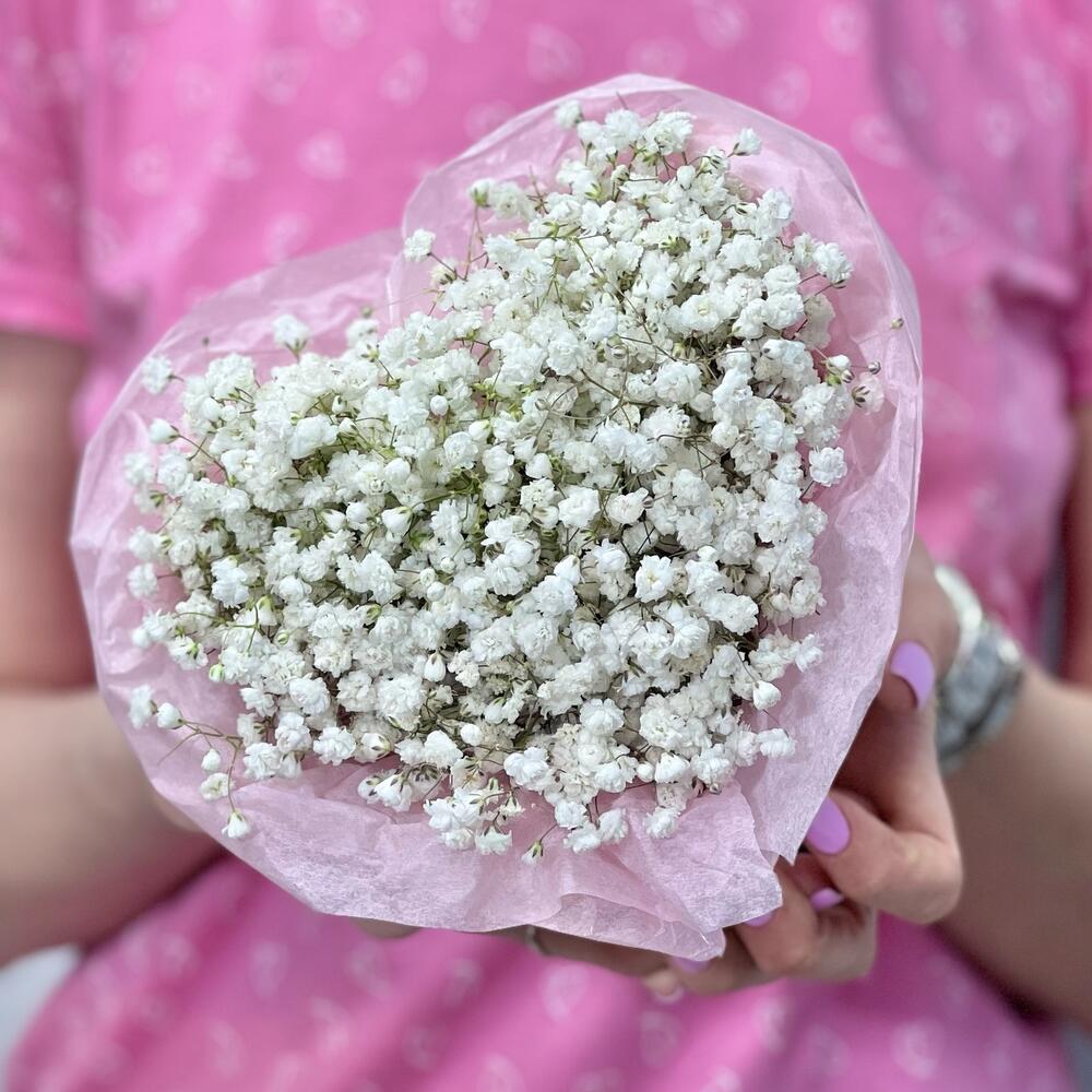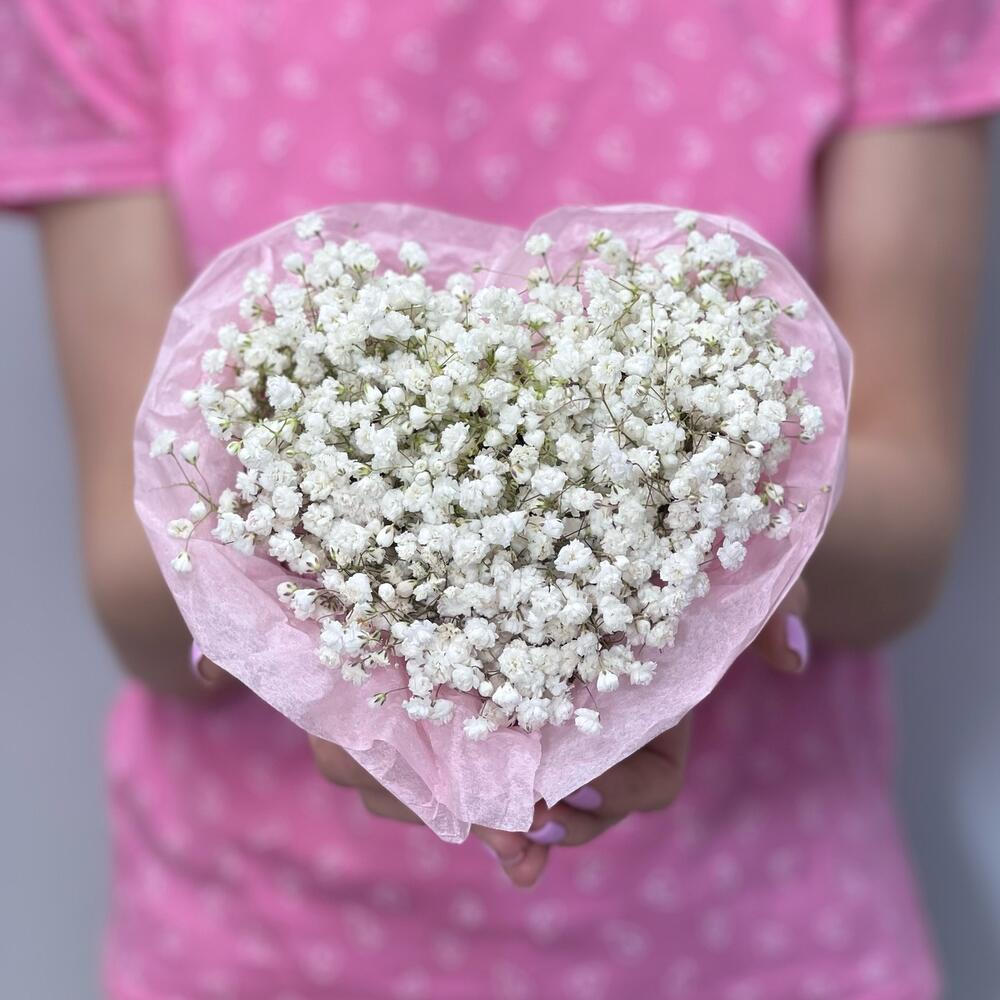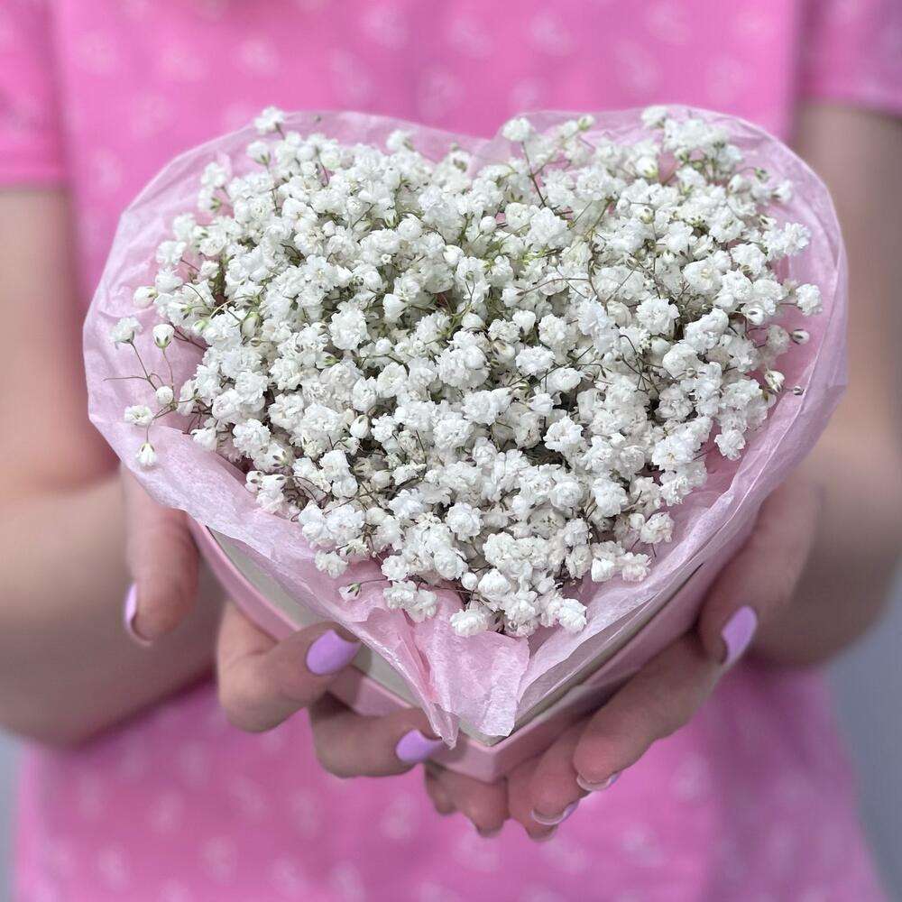Гипсофила - 3 шт. Коробка сердце - 1 шт. Оазис флористический - 1 шт. Бумага тишью - 1 шт.