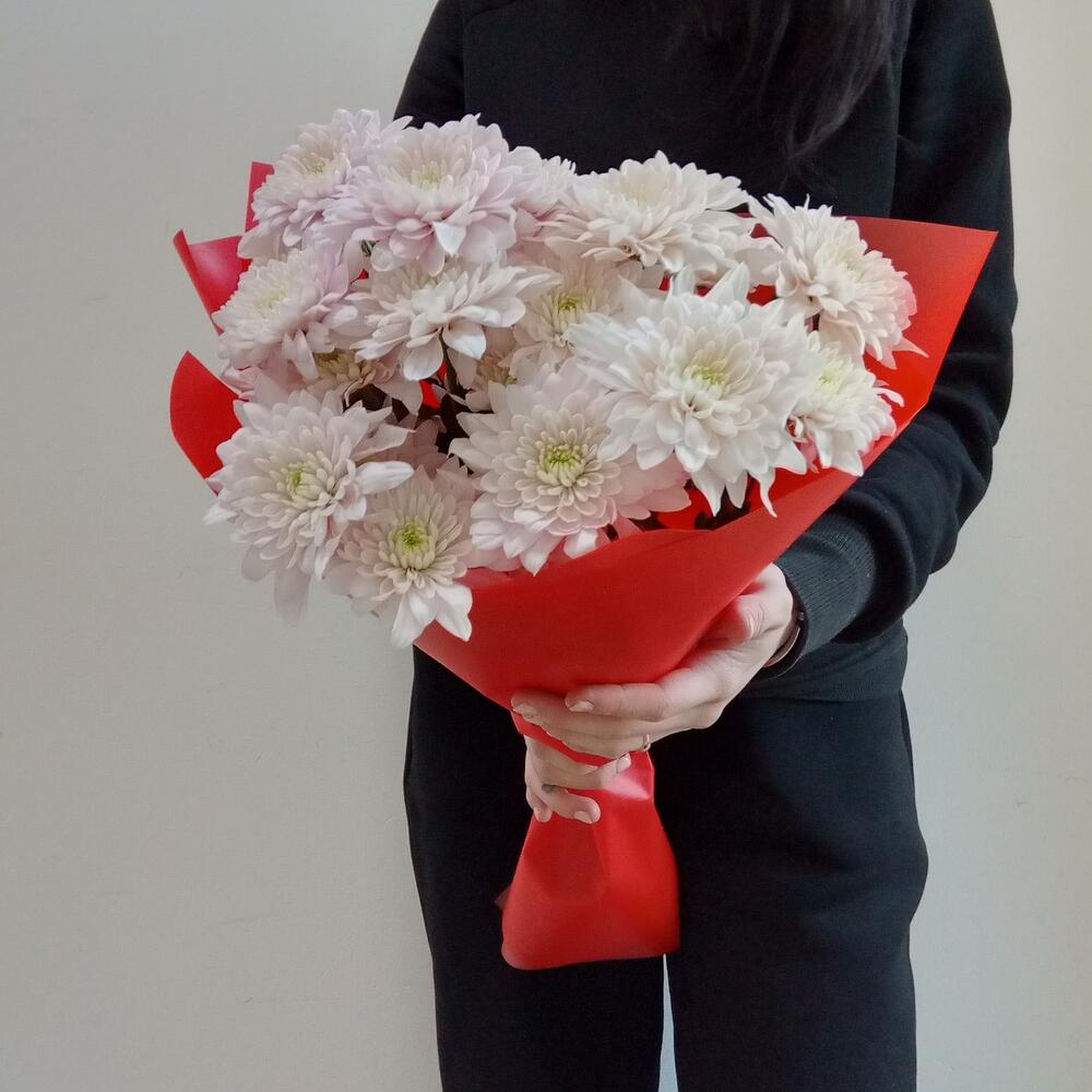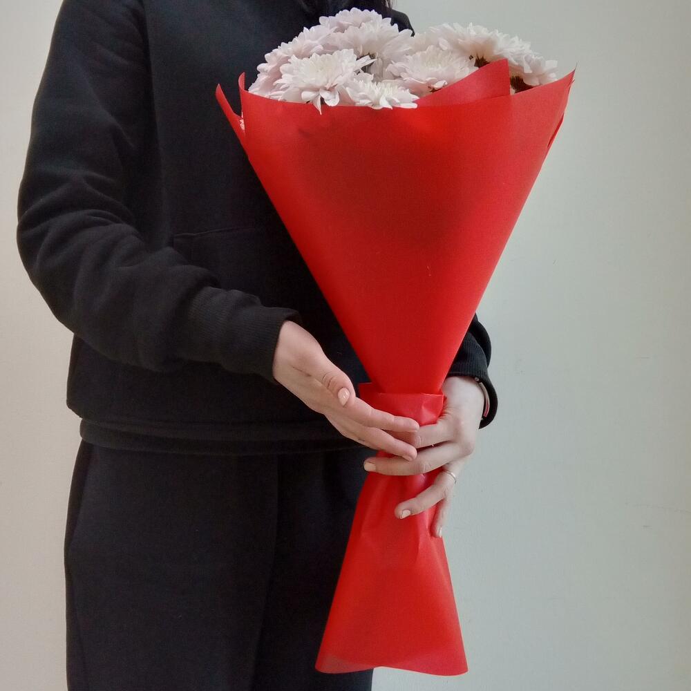 Нежная, пушистая стойка хризантема, в яркой упаковке