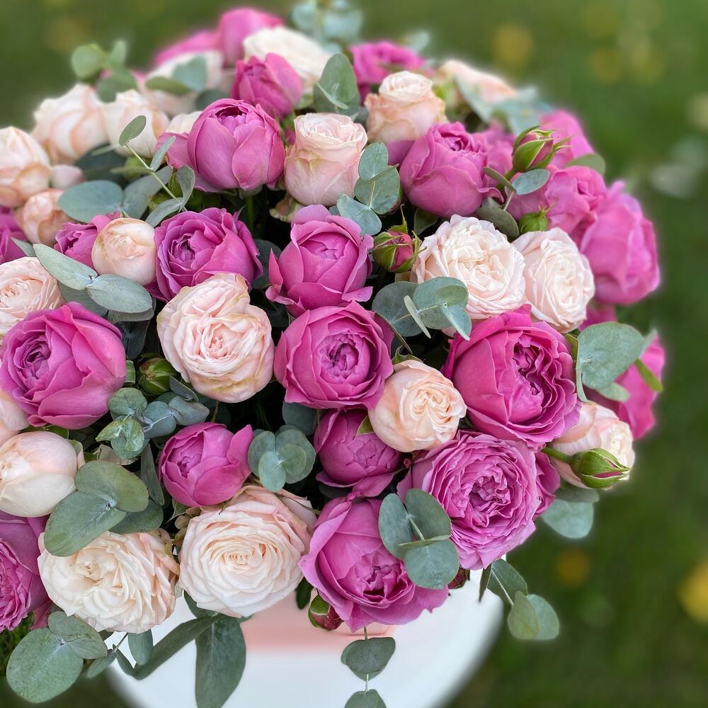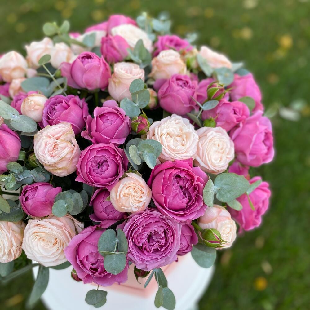 Коробка шляпная - 1 шт. Открыточка с вашими пожеланиями - 1 шт. Эвкалипт цинерария - 19 шт. Misty Bubbles пионовидная роза - 9 шт. бомбастик кустовая пионовидная роза - 6 шт.